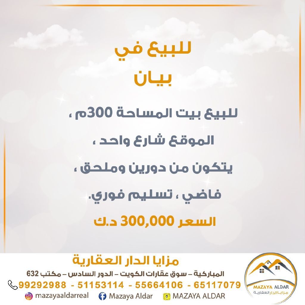 For sale: A house in the Bayan area with an area of 300 square meters, located on a single street. It consists of two floors and an annex, is vacant, and available for immediate delivery. For serious buyers only, and intermediaries are prohibited. Price: 300,000 dinars. For inquiries, contact via mobile.