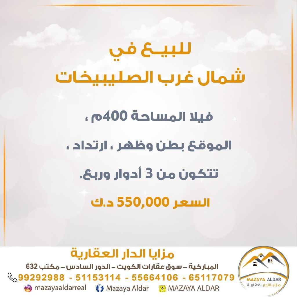 For sale: A villa in the Northwest Al-Sulaibikhat area, with a land area of 400 square meters. The location is corner (front and back), with a setback. It consists of 3 floors and a quarter. For serious buyers only, and brokers are prohibited. The price is 550,000 Kuwaiti Dinars. For inquiries, contact via mobile.
