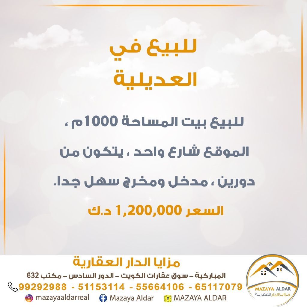 For sale: a house in the Adailiya area with an area of 1000 square meters. It is located on a single street and consists of two floors, with very easy access. For serious buyers only, and brokers are prohibited. The price is 1,200,000 Kuwaiti dinars. For inquiries, contact via mobile.