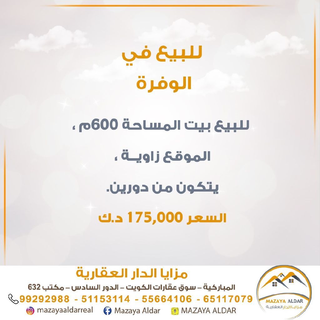 For sale, a house in the Al Wafra area with an area of 600 square meters. The location is on a corner, and it consists of two floors. For serious buyers only, and brokers are prohibited. The price is 175,000 dinars. For inquiries, contact the mobile number.