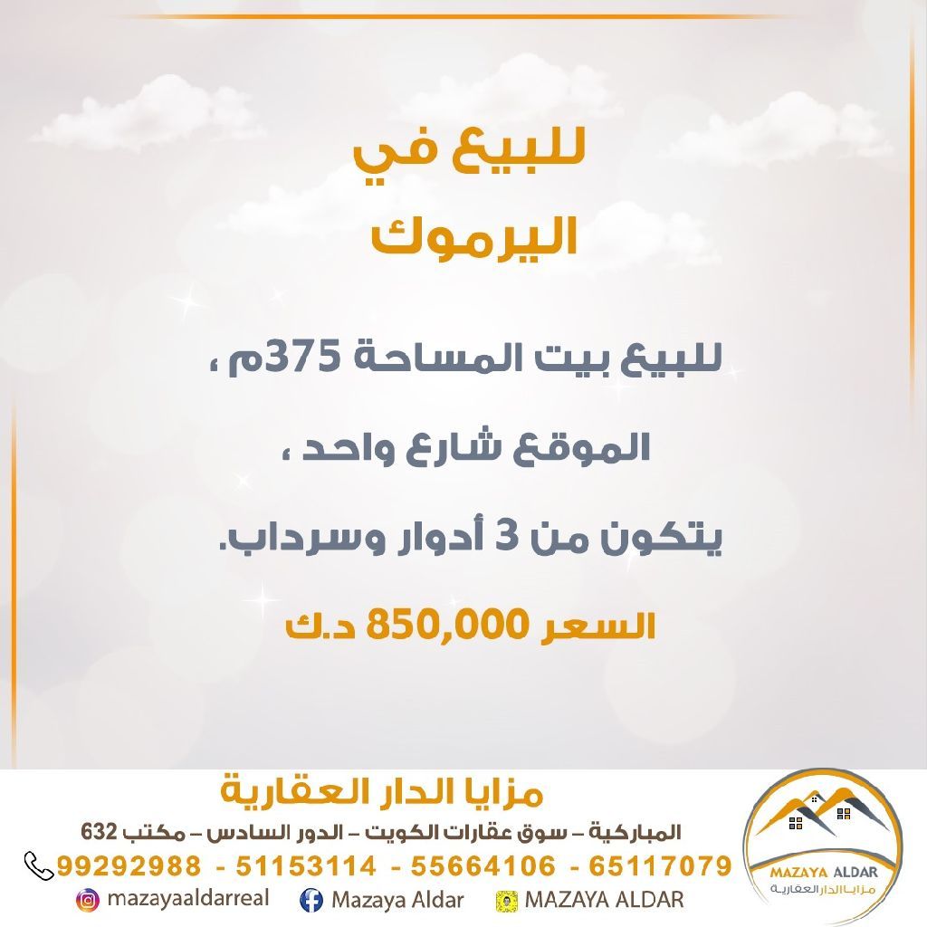 For sale: a house in the Al-Yarmouk area with an area of 375 square meters, located on a single street. It consists of 3 floors and a basement. For serious buyers only, and brokers are prohibited. The price is 850,000 dinars. For inquiries, contact the mobile number.