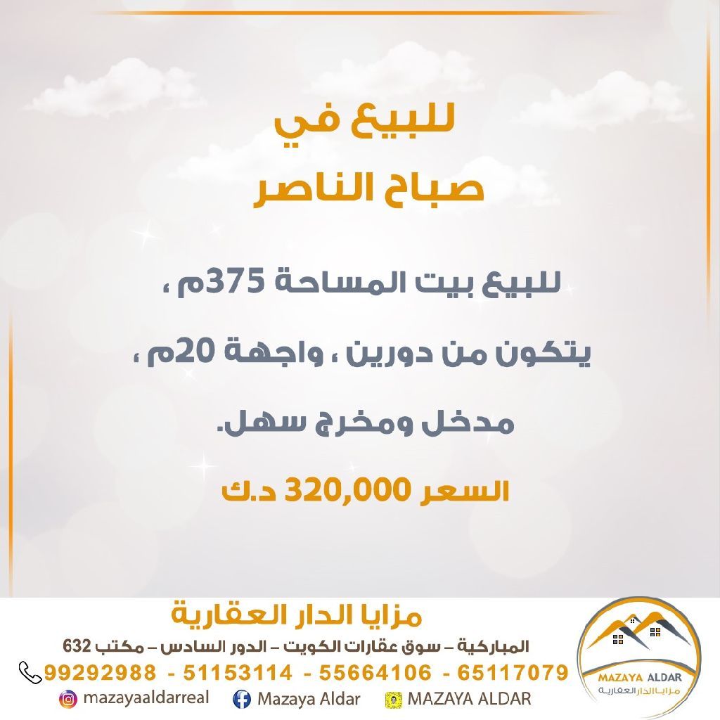 For sale: a house in the Sabah Al-Nasser area with an area of 375 square meters. It consists of two floors, a 20-meter frontage, and easy access. For serious buyers only; no brokers allowed. Price: 320,000 dinars. For inquiries, call the mobile number.