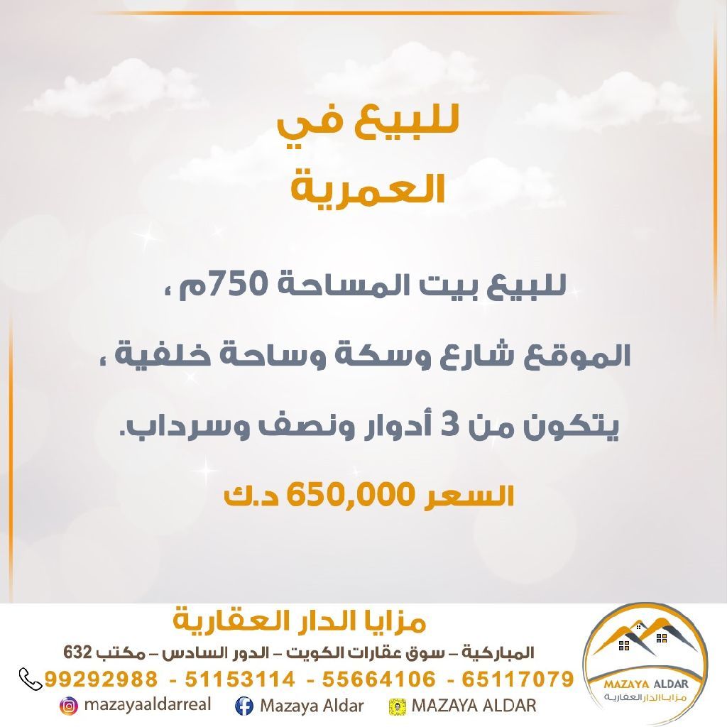 For sale: A house in the Al-Omariya area with an area of 750 square meters. The location includes a street, an alley, and a backyard. It consists of 3.5 floors and a basement. For serious buyers only, and brokers are prohibited. The price is 650,000 dinars. For inquiries, contact the mobile number.