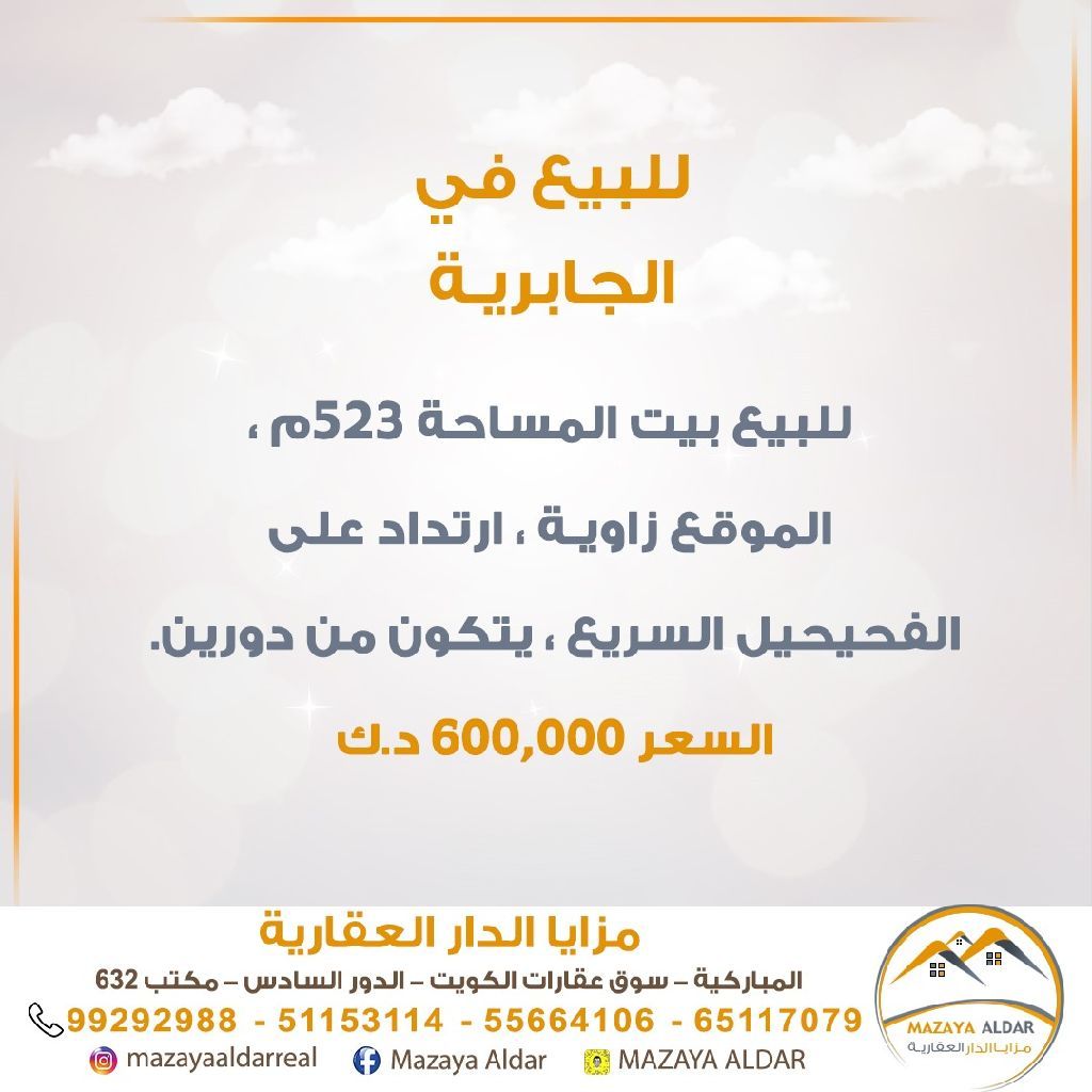 For sale: A house in the Jaberiya area with an area of 523 square meters. The location is on a corner, with a setback from the Fahaheel Expressway. It consists of two floors. For serious buyers only, and brokers are prohibited. The price is 600,000 Kuwaiti Dinars. For inquiries, contact via mobile.