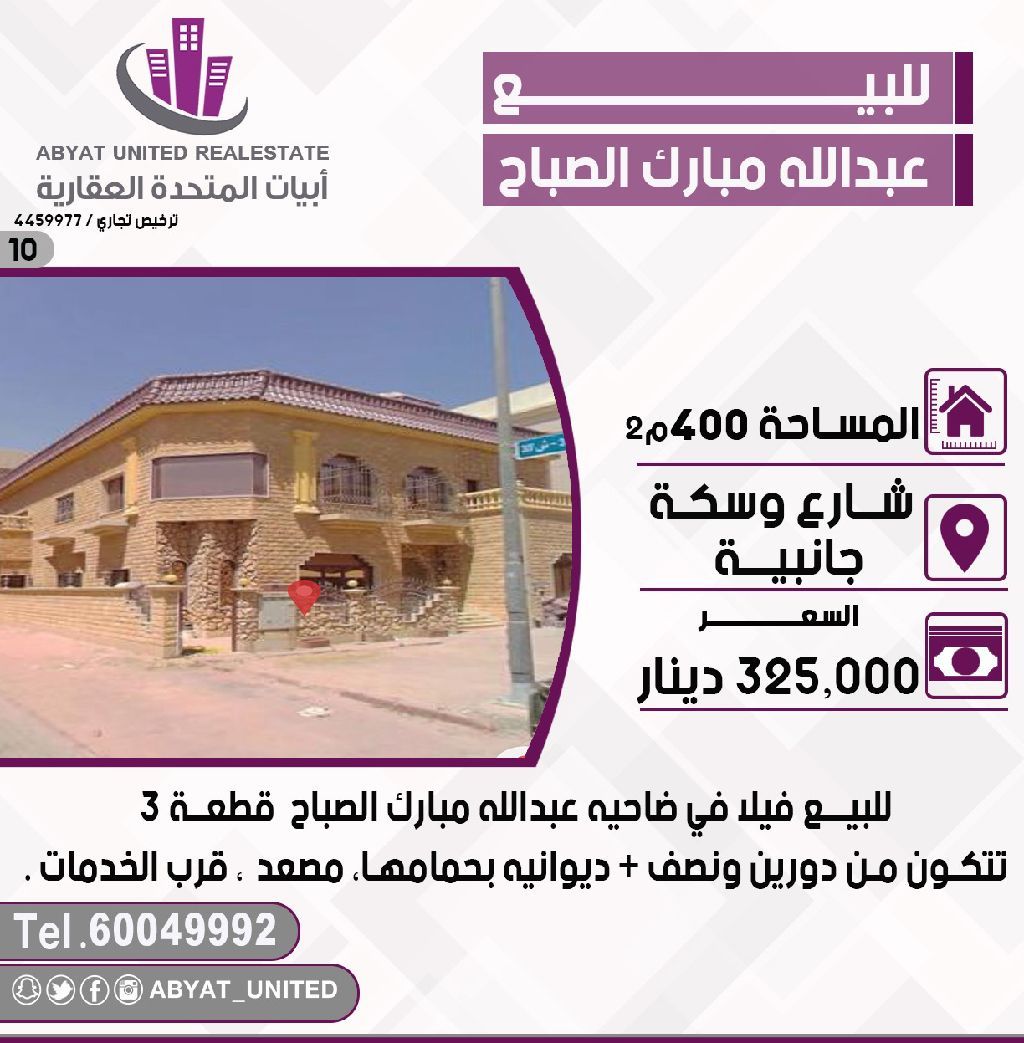 For sale: A villa in Abdullah Al-Mubarak Al-Sabah suburb, plot 3, located on a street with a side alley. The area is 400 square meters, consisting of two and a half floors, a diwaniya with its own bathroom, an elevator, and close to services. For inquiries, mobile number 1. Price: 325,000 Kuwaiti dinars, code 10.