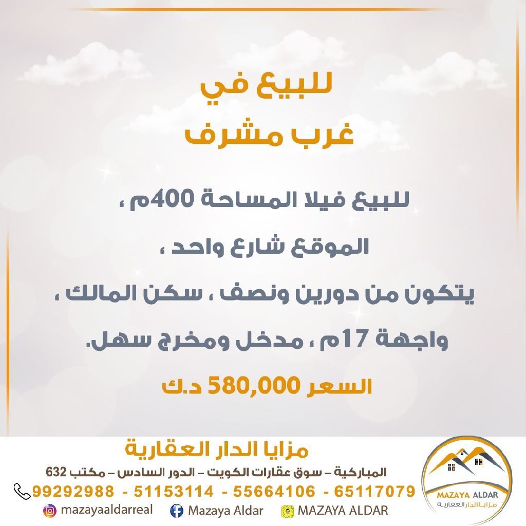 For sale: A villa in the West Mushrif area, with an area of 400 square meters. Located on a single street, it consists of two and a half floors, previously owner-occupied, with a 17-meter frontage, and easy access. For serious buyers only; brokers are prohibited. Price: 580,000 Kuwaiti Dinars. For inquiries, contact via mobile.