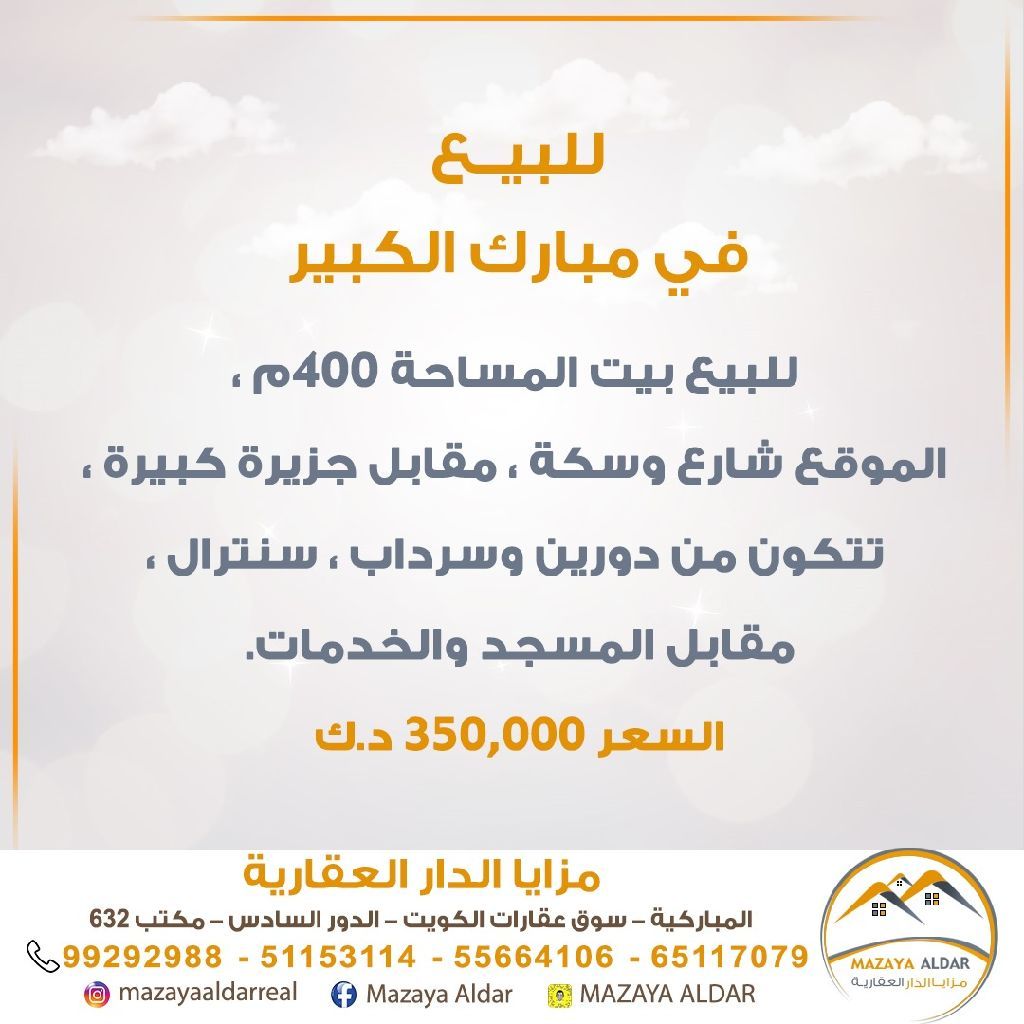 For sale: A house in the Mubarak Al-Kabeer area with an area of 400 square meters. The location is on a street and alley, opposite a large island. It consists of two floors and a basement, with central air conditioning, and is opposite a mosque and services. For serious buyers only, and brokers are prohibited. The price is 350,000 Kuwaiti dinars. For inquiries, contact via mobile.