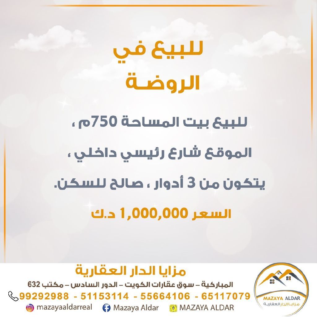 For sale: A house in the Rawda area with an area of 750 square meters. The location is on an internal main street. It consists of 3 floors and is suitable for living. For serious buyers only, and brokers are prohibited. The price is one million dinars. For inquiries, contact the mobile number.
