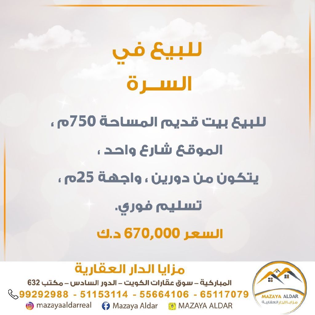 For sale: An old house in the Al-Surra area with an area of 750 square meters. The location is on a single street, consisting of two floors, with a 25-meter frontage. Immediate delivery. For serious buyers only, and brokers are prohibited. The price is 670,000 dinars. For inquiries, call the mobile number.