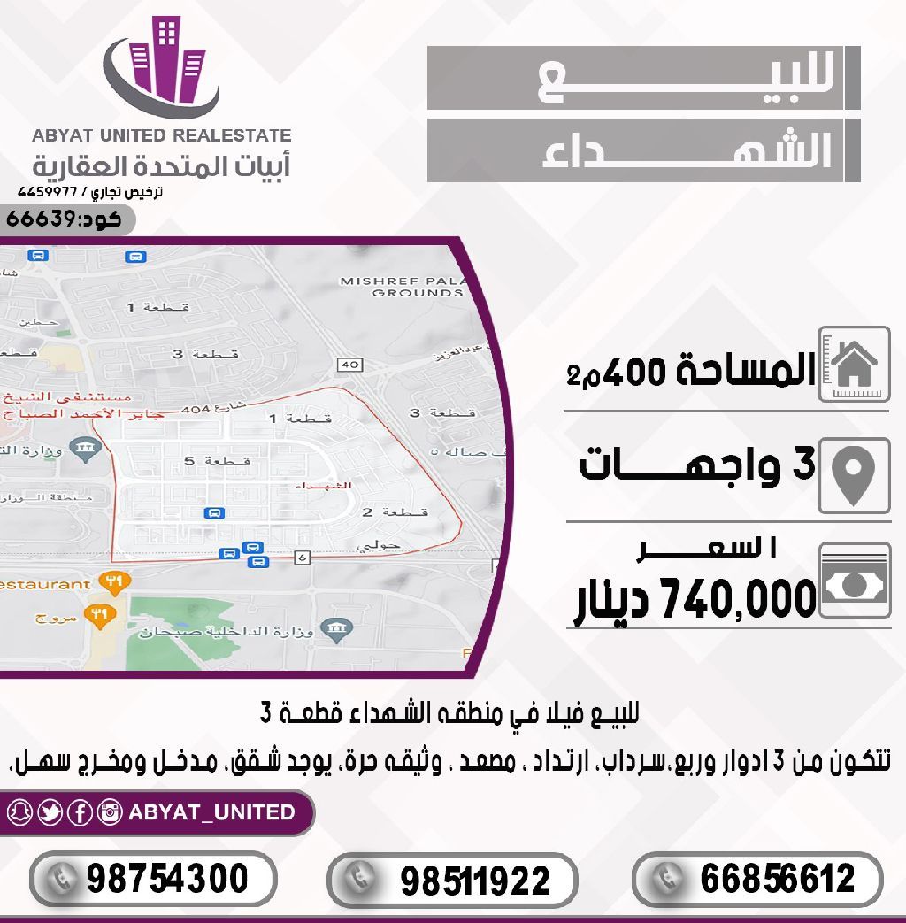 For sale: A villa in the Al-Shuhada area, Plot 3, with 3 facades, area 400 m², consisting of 3 floors and a quarter, basement, setback, elevator, freehold document, includes apartments, easy access. For inquiries, Mobile 1, Mobile 2, Mobile 3. Price 740,000 dinars. Code 66639.