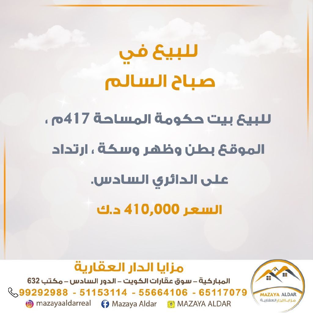 For sale: A government house in the Sabah Al-Salem area, with an area of 417 square meters. The location has front and back access and a street, with a setback on the Sixth Ring Road. For serious buyers only, and brokers are prohibited. The price is 410,000 Kuwaiti dinars. For inquiries, contact the mobile number.