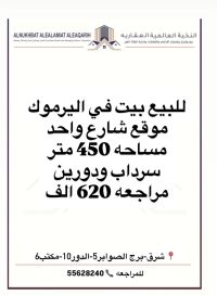 For sale: A house in Al-Yarmouk, located on a single street, with an area of 450 square meters. It includes a basement and two floors. The review price is 620,000, and the license is valid until 2025. Reference: 501.
