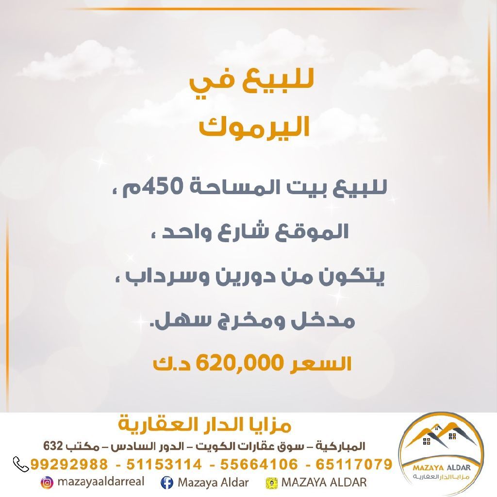 For sale: A house in the Al-Yarmouk area with an area of 450 square meters. The location is on a single street, consisting of two floors and a basement, with easy access. For serious buyers only, no brokers allowed. Price: 620,000 dinars. For inquiries, call the mobile number.