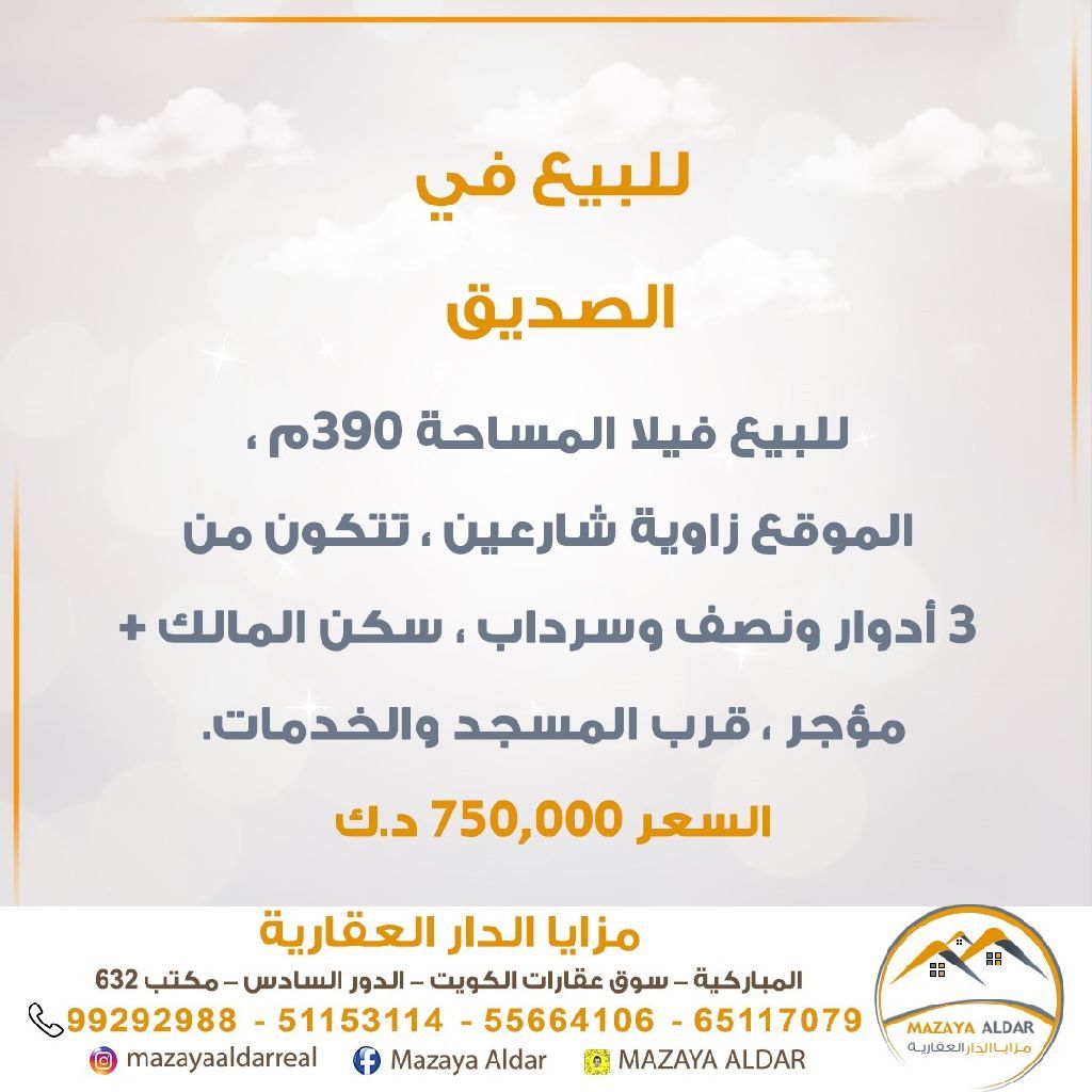 For sale: A villa in Al Sadeeq suburb with an area of 390 square meters. The location is at the corner of two streets. It consists of 3.5 floors and a basement. Owner-occupied and rented. Close to the mosque and services. For serious buyers only; no brokers allowed. Price: 750,000 dinars. For inquiries, call the mobile number.