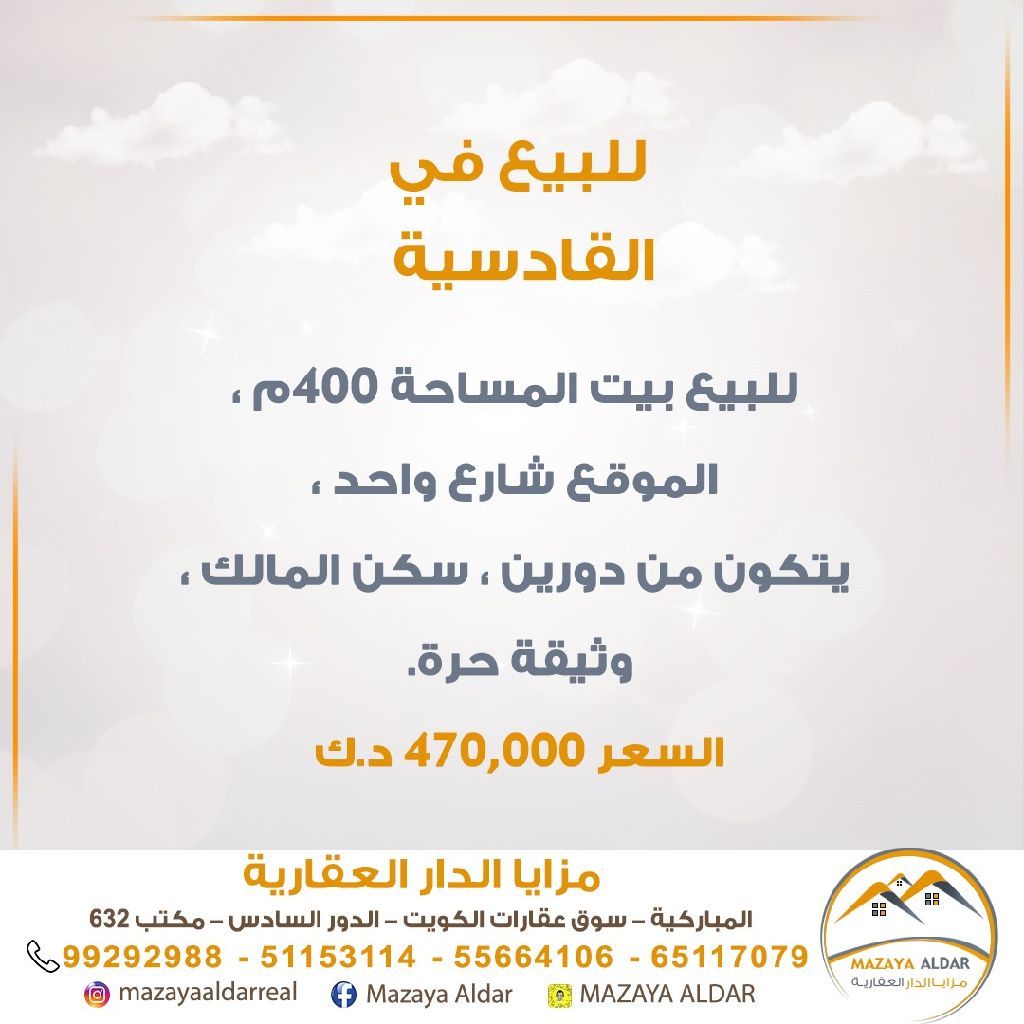 For sale: A house in the Al-Qadisiyya area with an area of 400 square meters, located on a single street. It consists of two floors, was owner-occupied, and has a freehold title. For serious buyers only, and brokers are prohibited. The price is 470,000 dinars. For inquiries, contact the mobile number.