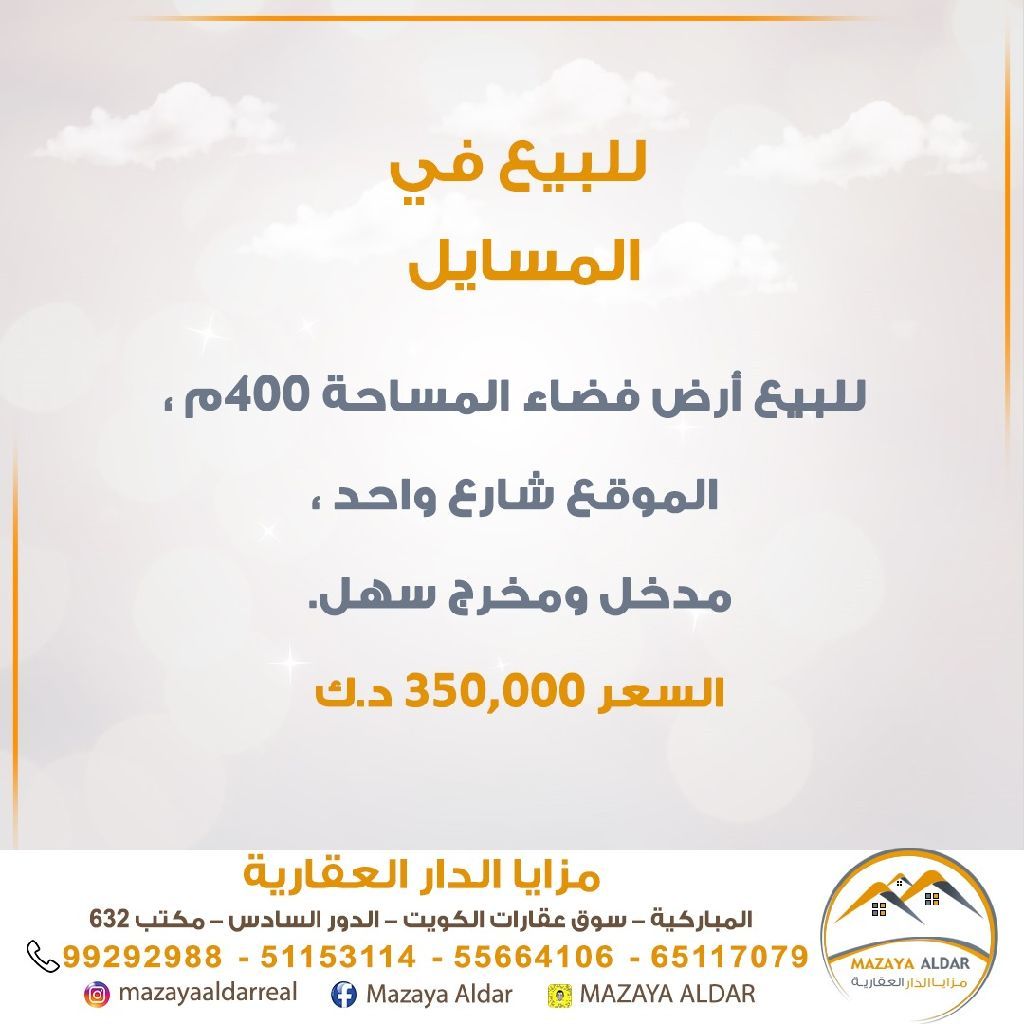 For sale: a vacant plot in the Al-Masayel suburb, with an area of 400 square meters, located on a single street, with easy access and exit. For serious buyers only, brokers are prohibited. The price is 350,000 Kuwaiti dinars. For inquiries, call the mobile number.