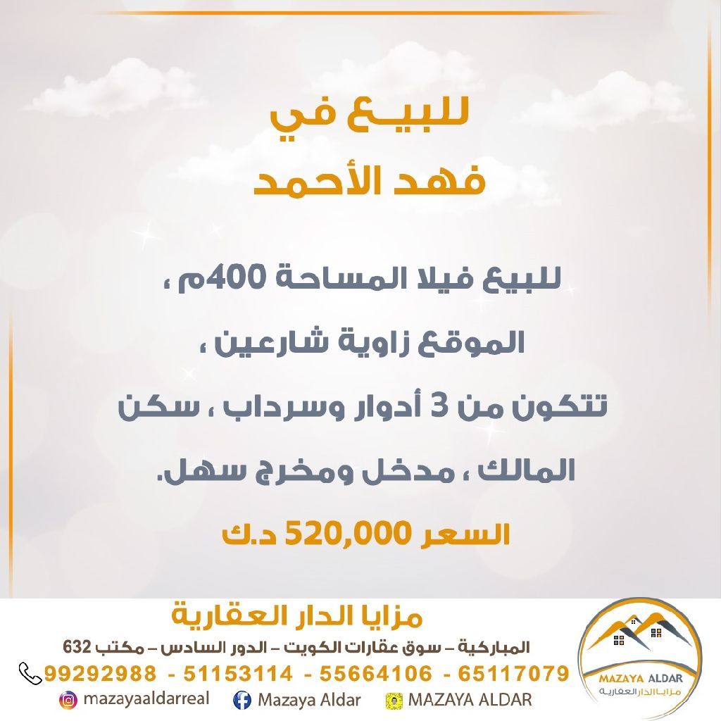 For sale: A villa in the Fahad Al-Ahmad area with an area of 400 square meters. The location is at the corner of two streets. It consists of three floors and a basement, was owner-occupied, and has easy access and exit. For serious buyers only, and brokers are prohibited. The price is 520,000 dinars. For inquiries, contact the mobile number.