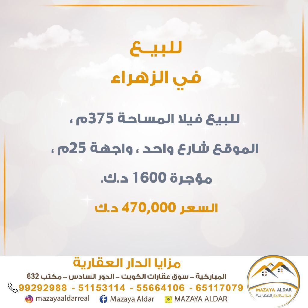 For sale: A villa in Al Zahraa suburb with an area of 375 square meters, located on a single street, with a 25-meter frontage, currently rented for 1600 Kuwaiti dinars. Serious buyers only, no brokers allowed. Price: 470,000 Kuwaiti dinars. For inquiries, contact via mobile.