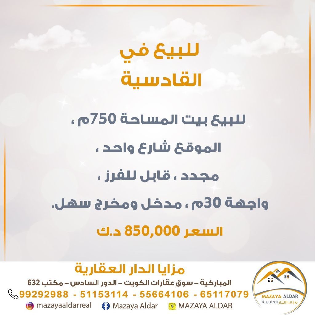 For sale: A house in the Al-Qadisiyah area with an area of 750 square meters. Located on a single street, it is renovated, divisible, with a 30-meter frontage, and easy access. For serious buyers only; no brokers allowed. Price: 850,000 Kuwaiti Dinars. For inquiries, contact via mobile.