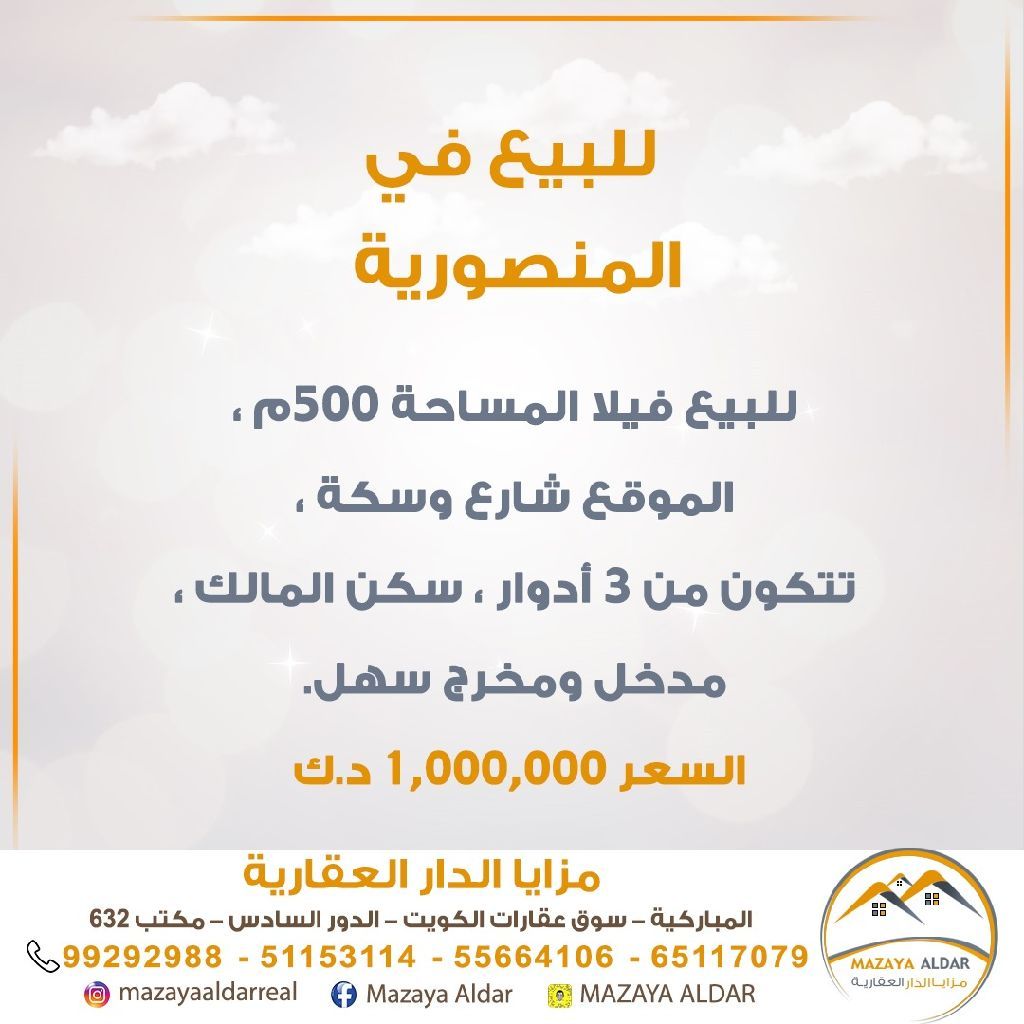 For sale: A villa in the Al-Mansouriya area with an area of 500 square meters. The location is on a street and alley, consisting of 3 floors, owner-occupied, with easy access. For serious buyers only, no brokers allowed. Price: 1,000,000 dinars. For inquiries, call the mobile number.