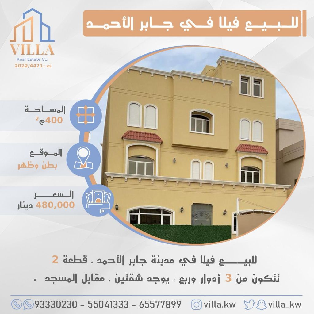 For sale: A villa in Jabir Al-Ahmad City, Plot 2, with an area of 400 square meters. The location is front and back. It consists of 3 floors and a quarter, with two apartments, opposite the mosque. Price: 480,000 Kuwaiti Dinars. For inquiries, call mobile 1, mobile 2, mobile 3.