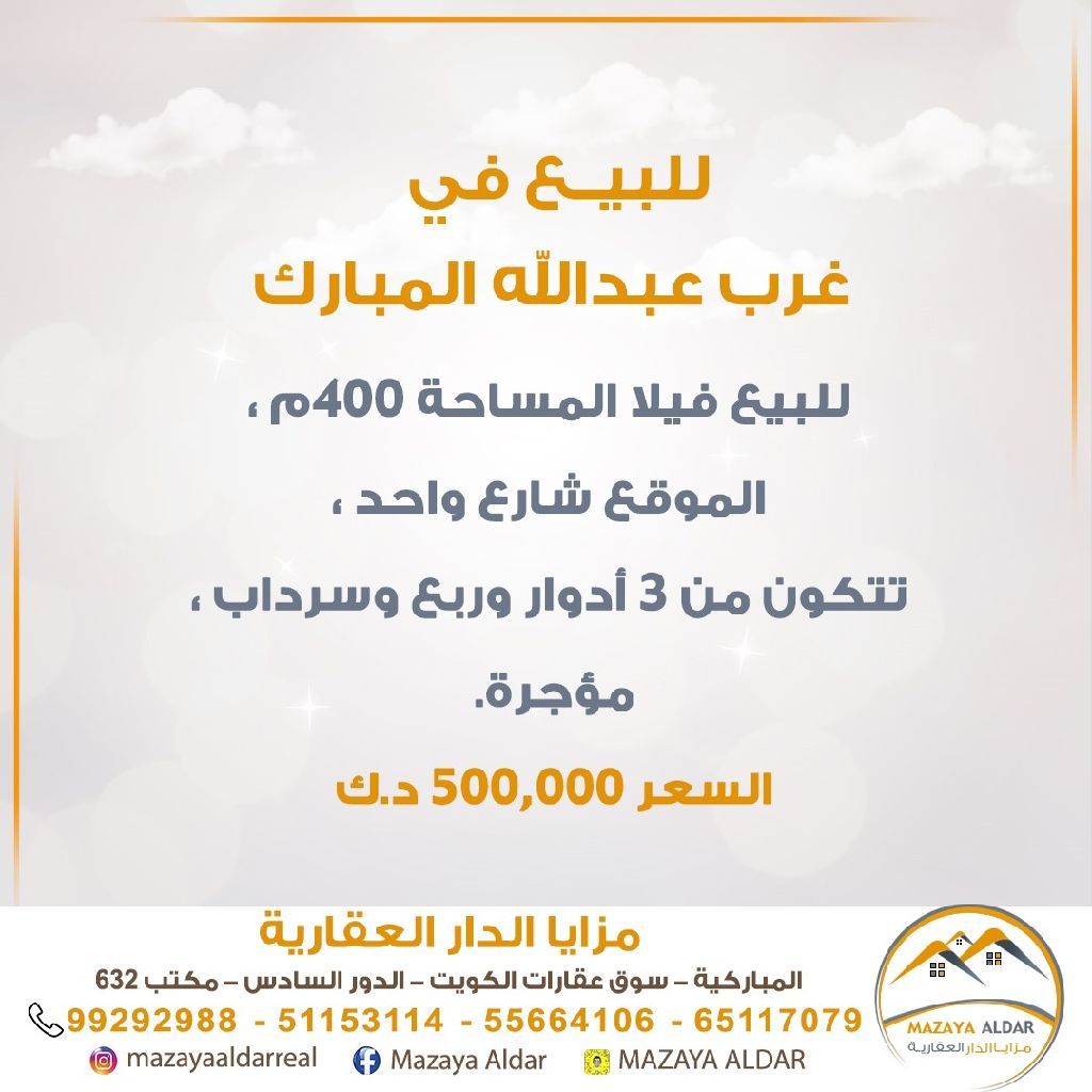 For sale: A villa in the West Abdullah Al-Mubarak Al-Sabah area, with an area of 400 square meters, located on a single street. It consists of 3 floors, a quarter floor, and a basement, and it is rented. For serious buyers only, and brokers are prohibited. The price is 500,000 Kuwaiti dinars. For inquiries, contact via mobile.