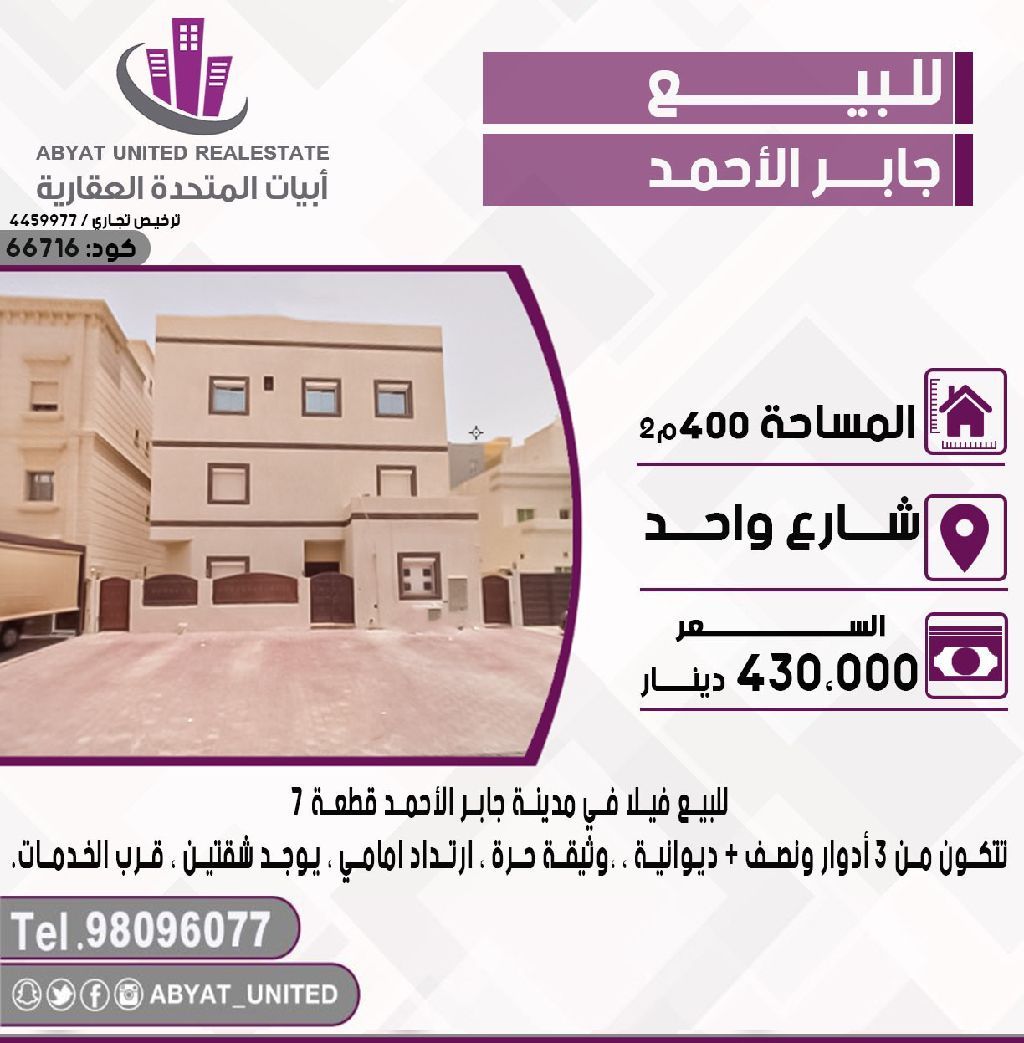 For sale: A villa in Jaber Al-Ahmad City, Plot 7, located on a single street. The area is 400 square meters, consisting of 3.5 floors, a diwaniya, freehold document, front setback, includes two apartments, and is near services. For inquiries, call mobile number 1. Price: 430,000 Kuwaiti dinars. Code: 4.