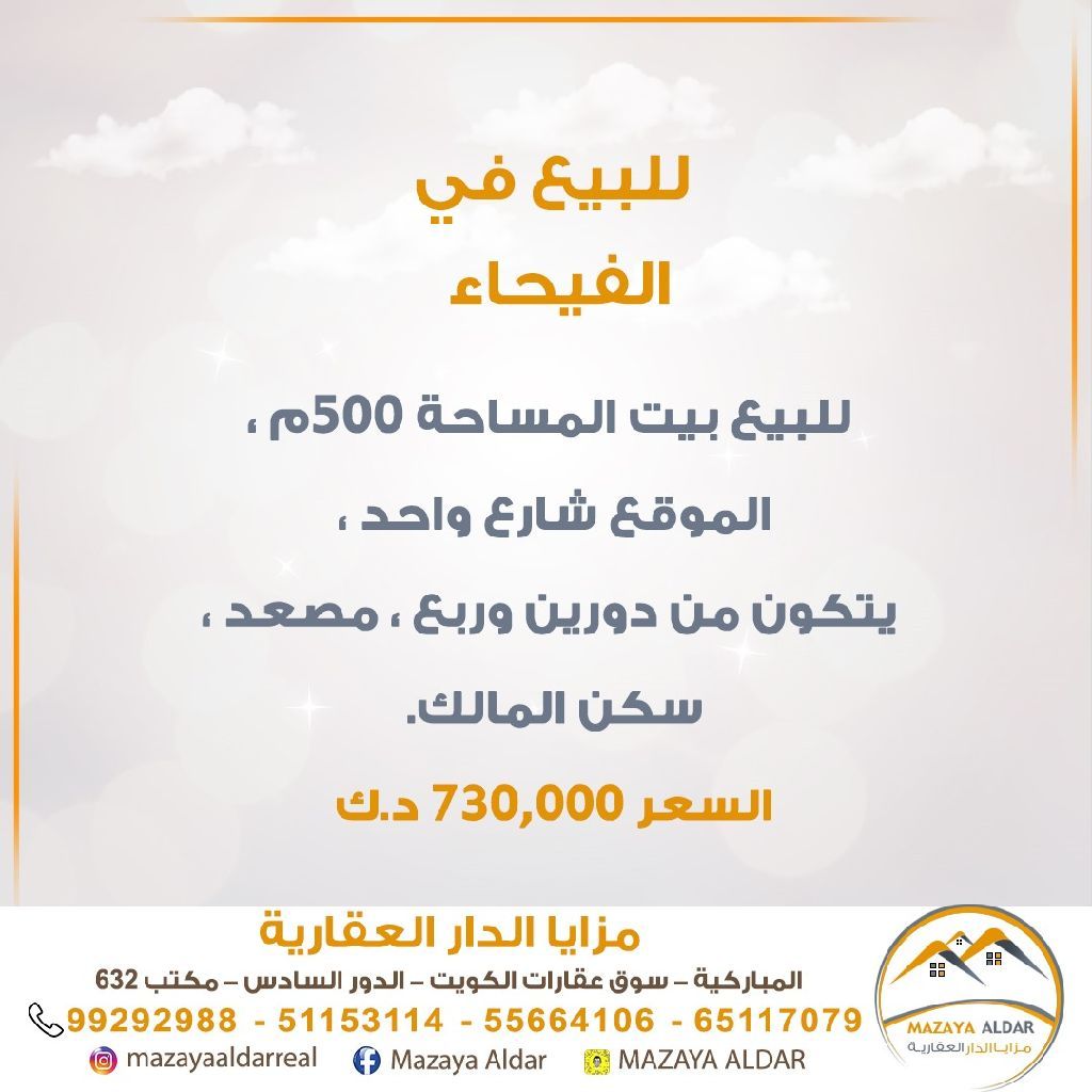 For sale: A house in the Al-Faiha area with an area of 500 square meters, located on a single street. It consists of two and a quarter floors, has an elevator, and was owner-occupied. For serious buyers only, and brokers are prohibited. The price is 730,000 dinars. For inquiries, contact the mobile number.