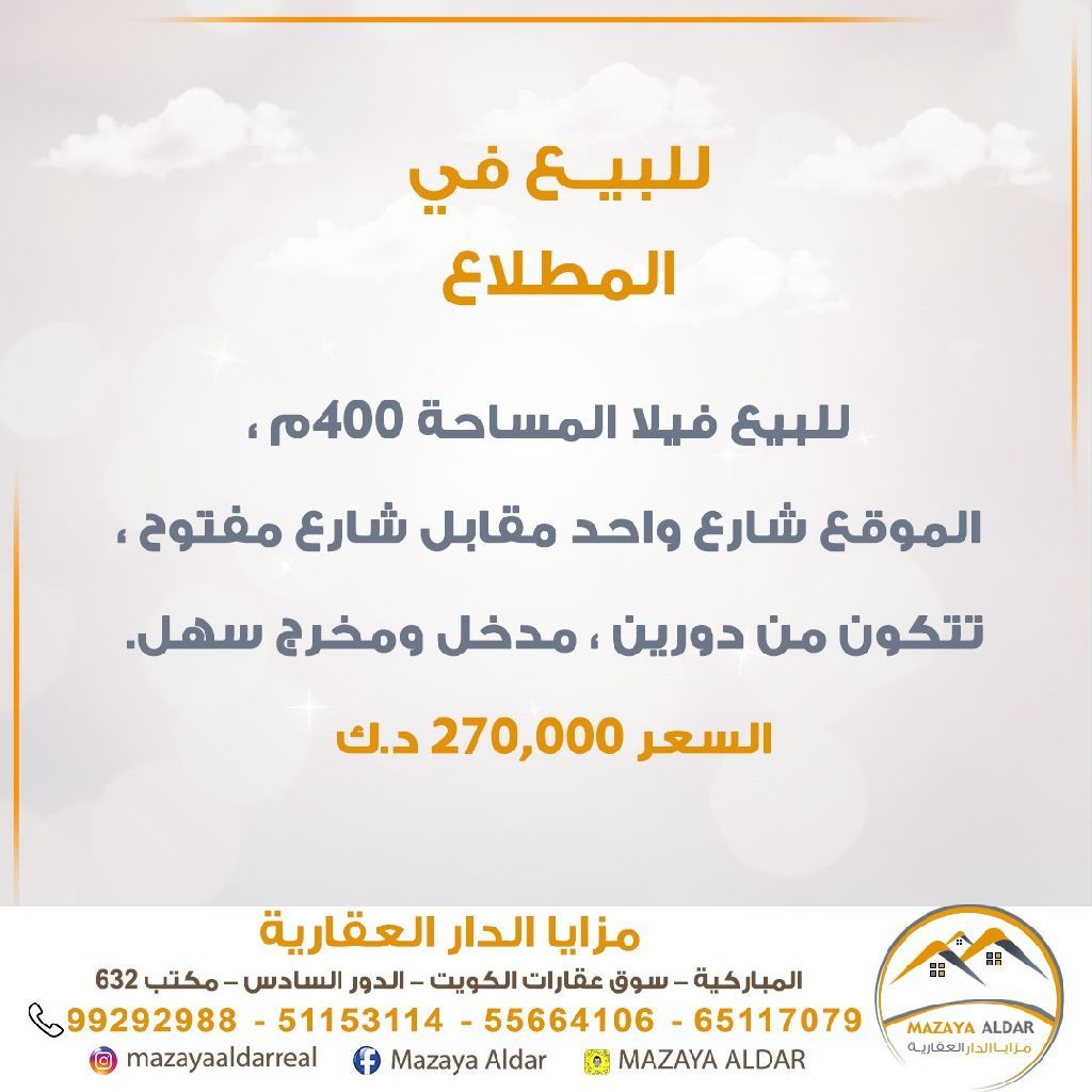 For sale: A villa in the Al-Mutlaa area with an area of 400 square meters. The location is on a single street opposite an open street. It consists of two floors with an easy entrance and exit. For serious buyers only; brokers are prohibited. The price is 270,000 Kuwaiti dinars. For inquiries, contact via mobile.