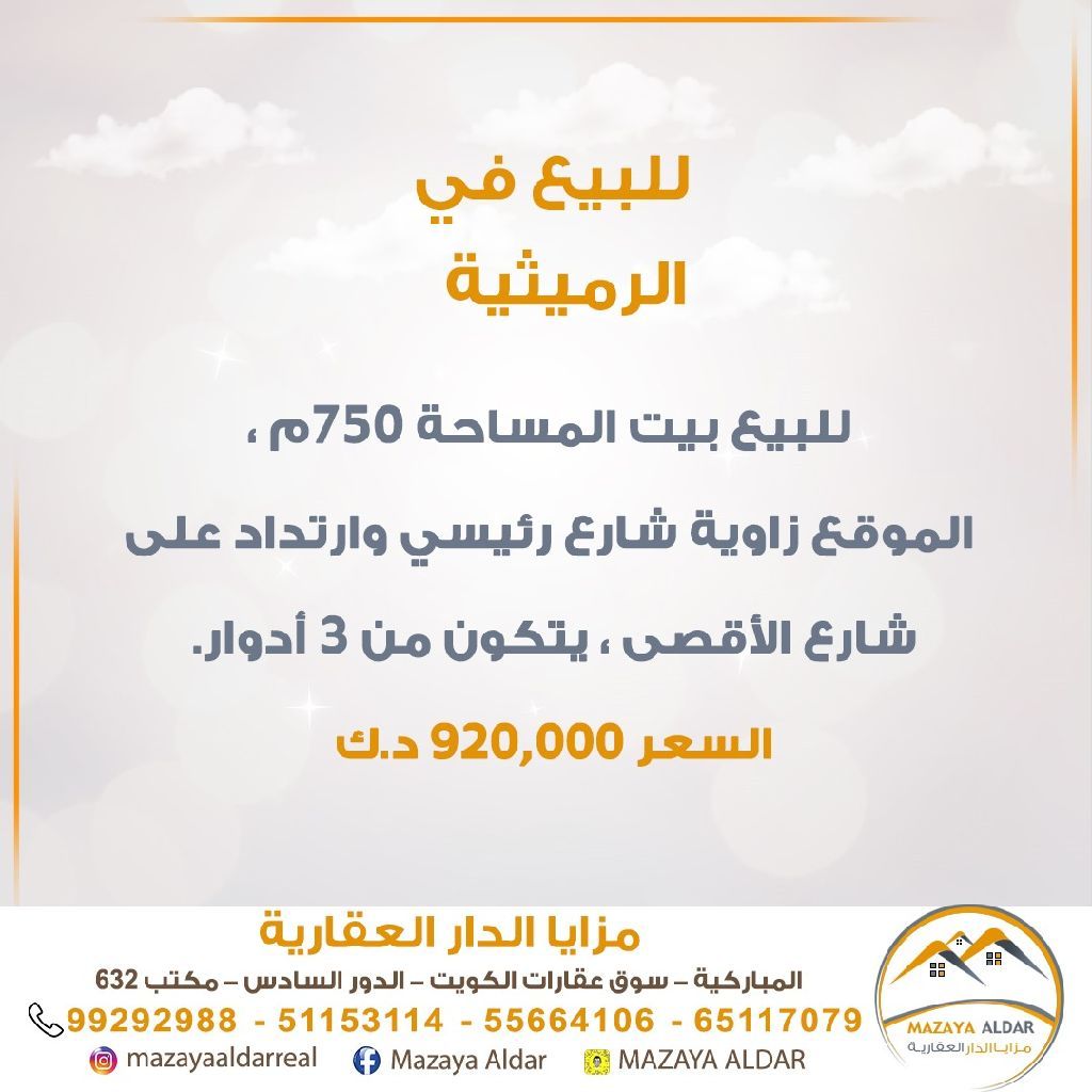 For sale: a house in the Al-Rumaithiya area with an area of 750 square meters. The location is at the corner of a main street and set back from Al-Aqsa Street. It consists of 3 floors. For serious buyers only, and brokers are prohibited. The price is 920,000 dinars. For inquiries, contact the mobile number.