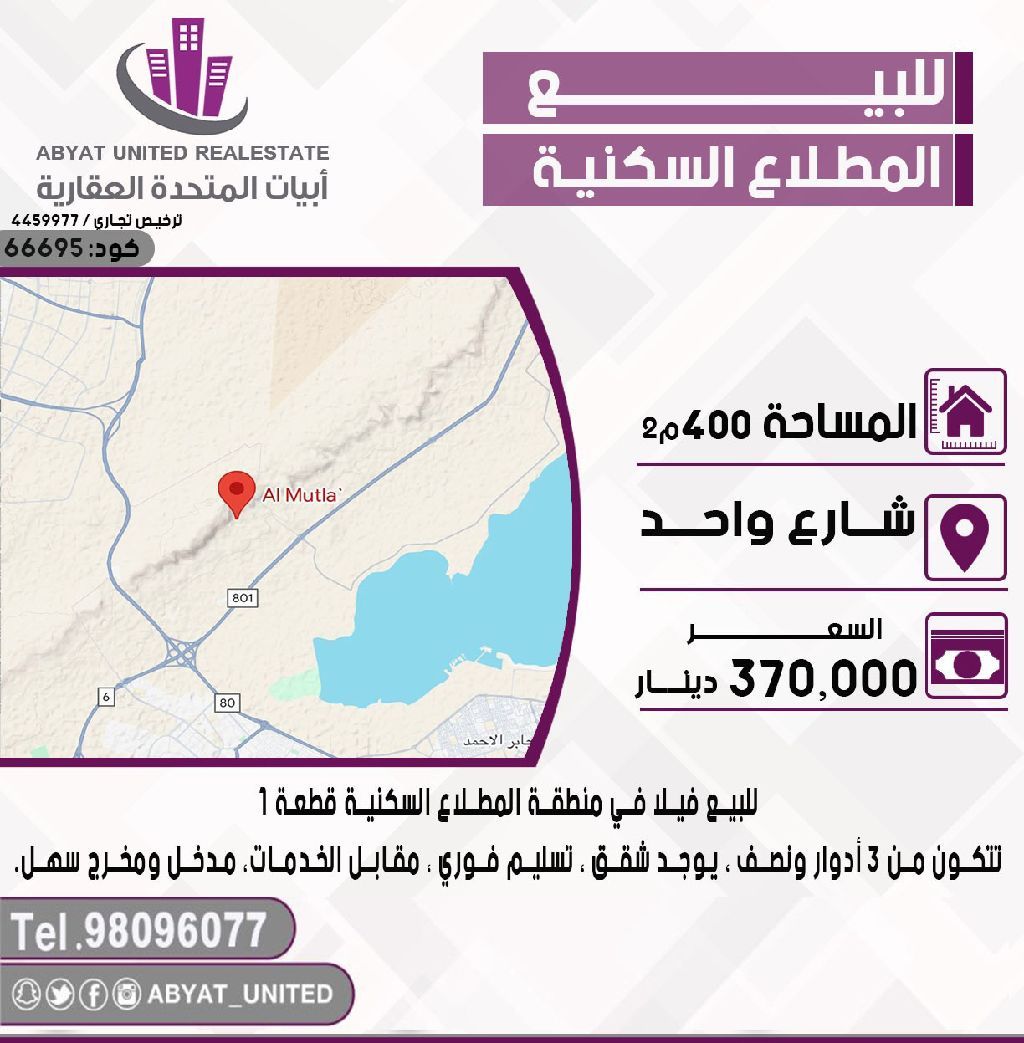 For sale: A villa in the Al-Mutla'a residential area, Plot 1, located on a single street. The area is 400 square meters, consisting of 3.5 floors, with apartments available. Immediate handover, opposite services, with easy access. For inquiries, mobile number 1. Price: 370,000 dinars. Code: 4.