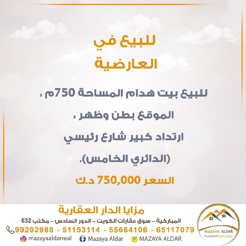 For sale: a demolished house in the Al-Ardiya area, with a land area of 750 square meters. The location is in a prime position with large setbacks on a main road (Fifth Ring Road). Serious buyers only, and brokers are prohibited. The price is 750,000 Kuwaiti dinars. For inquiries, contact via mobile.