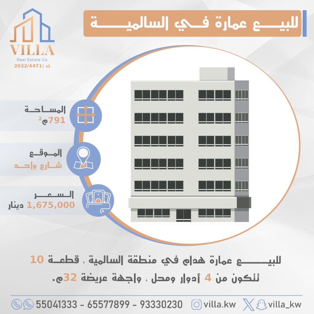 For sale: A demolished building in the Salmiya area, Plot 10, area 791 sqm, located on a single street. It consists of 4 floors and a shop, with a wide facade of 32m. Price: 1,675,000 Kuwaiti Dinars. For inquiries, call: 1, 2, 3.