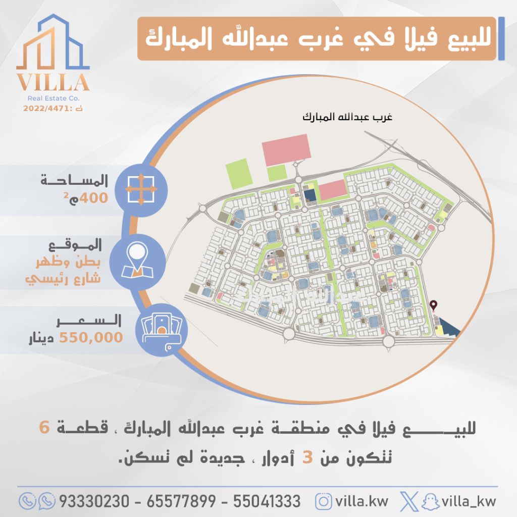 For sale: A villa in the West area - Abdullah Al-Mubarak Al-Sabah, Plot 6, area 400 sqm, located on a main street with front and back access, consisting of 3 floors, new and never occupied. Price 550,000 Kuwaiti Dinars. For inquiries, call mobile 1, mobile 2, mobile 3.