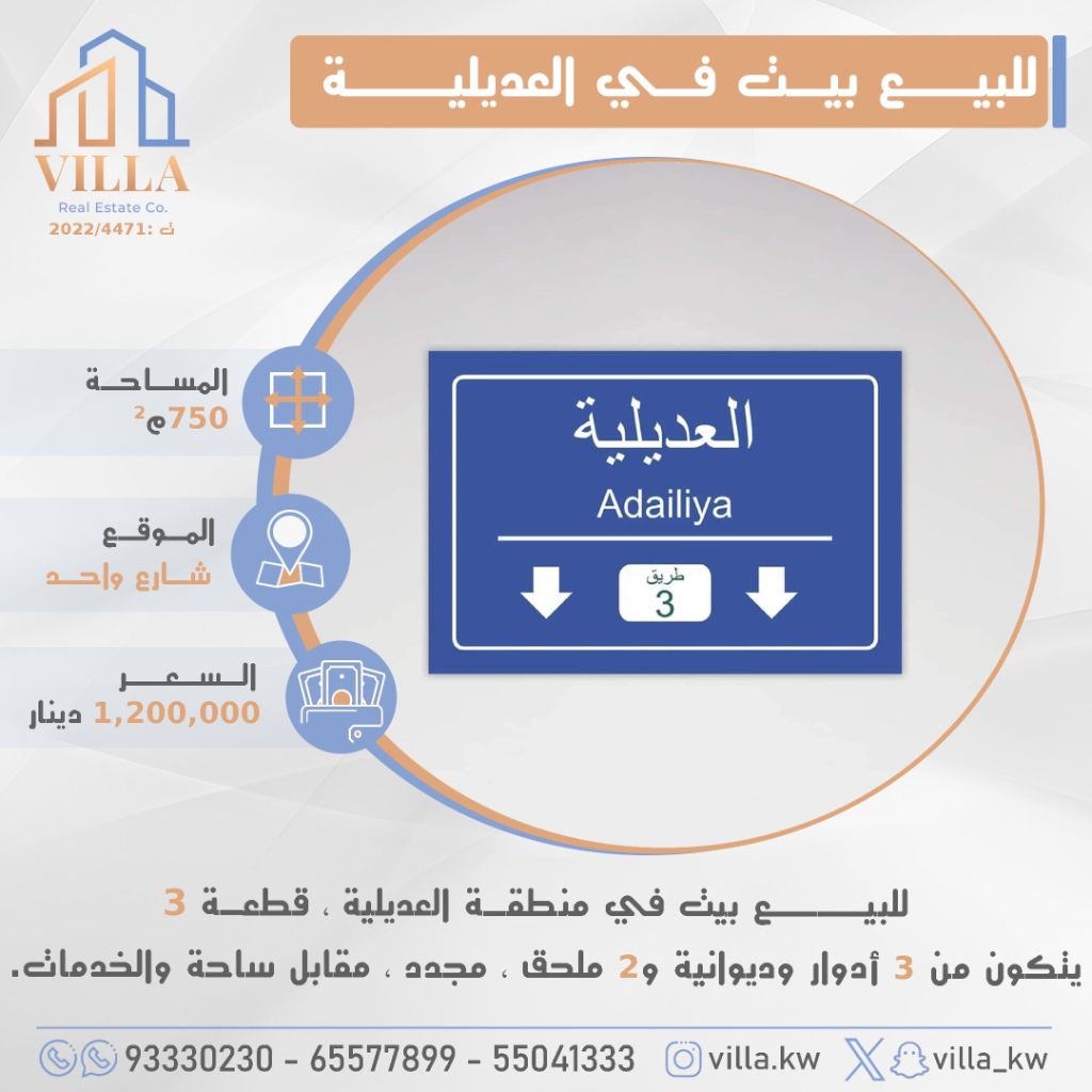 For sale: a house in the Adailiya area, Plot 3, with an area of 750 square meters, located on a single street. It consists of 3 floors, a diwaniya, and 2 annexes. It is renovated and faces a square with services. Price: 1,200,000 Kuwaiti dinars. For inquiries, call mobile 1, mobile 2, mobile 3.