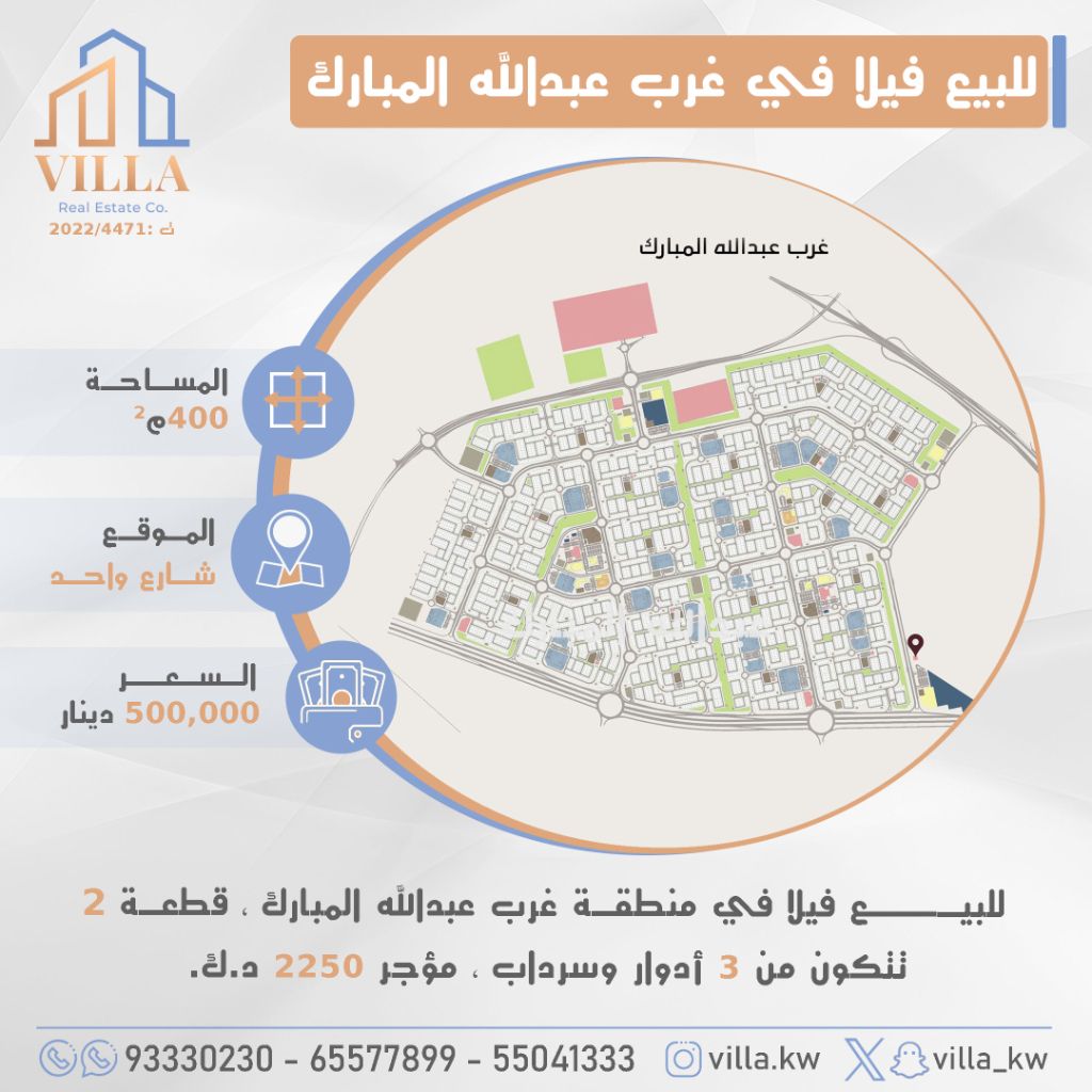 For sale: A villa in the West area - Abdullah Al-Mubarak Al-Sabah, Plot 2, Area 400m, located on a single street. It consists of 3 floors and a basement, rented for 2250 KD. Price: 500,000 KD. For inquiries, call: Mobile 1, Mobile 2, Mobile 3.