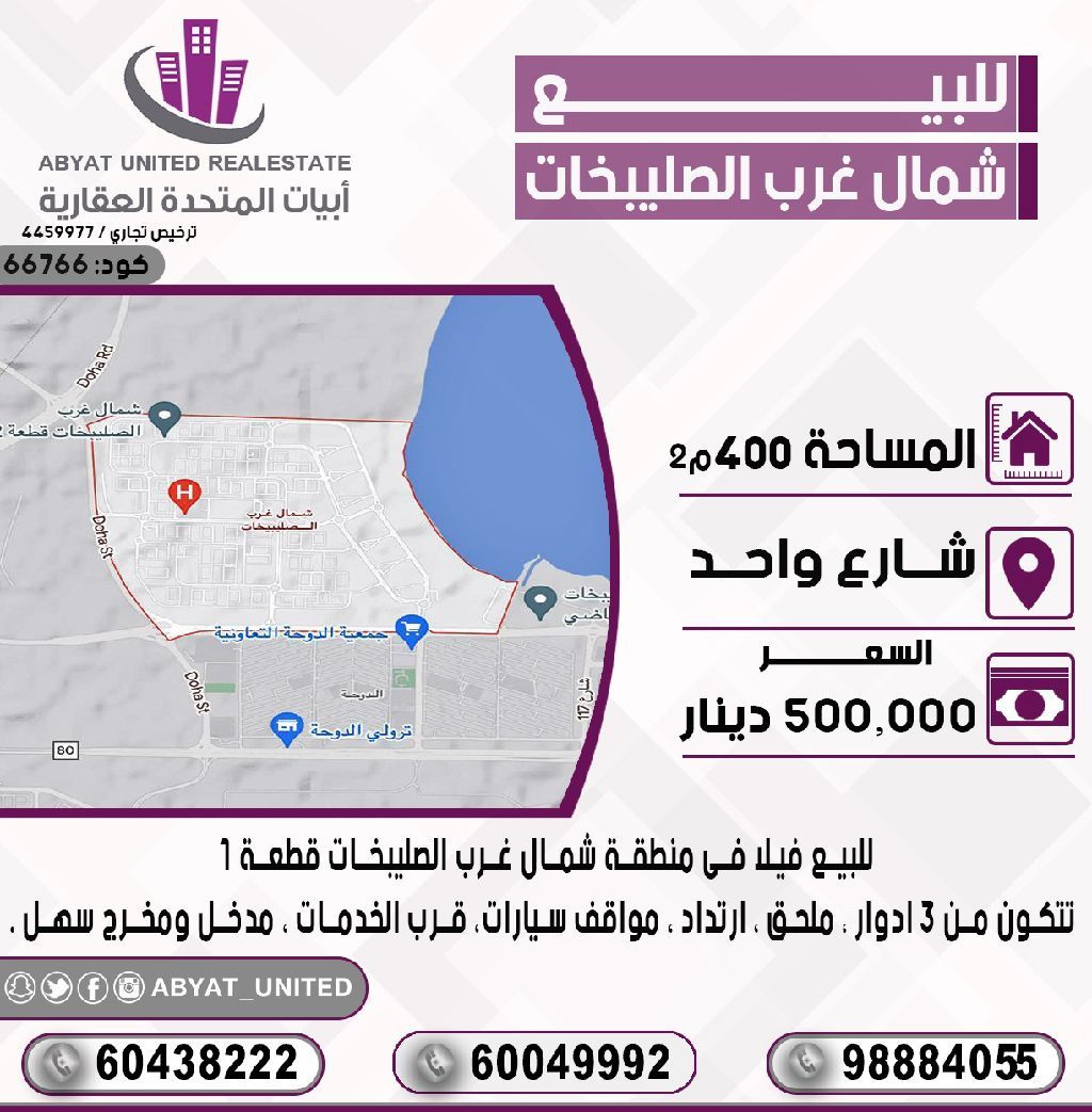 For sale: A villa in the Northwest Al-Sulaibikhat area, Plot 1. The location is on a single street, with an area of 400 square meters. It consists of 3 floors, an annex, a setback, car parking, proximity to services, and easy access. For inquiries, contact Mobile 1, Mobile 2, Mobile 3. Price: 500,000 Kuwaiti Dinars. Code: 66766.