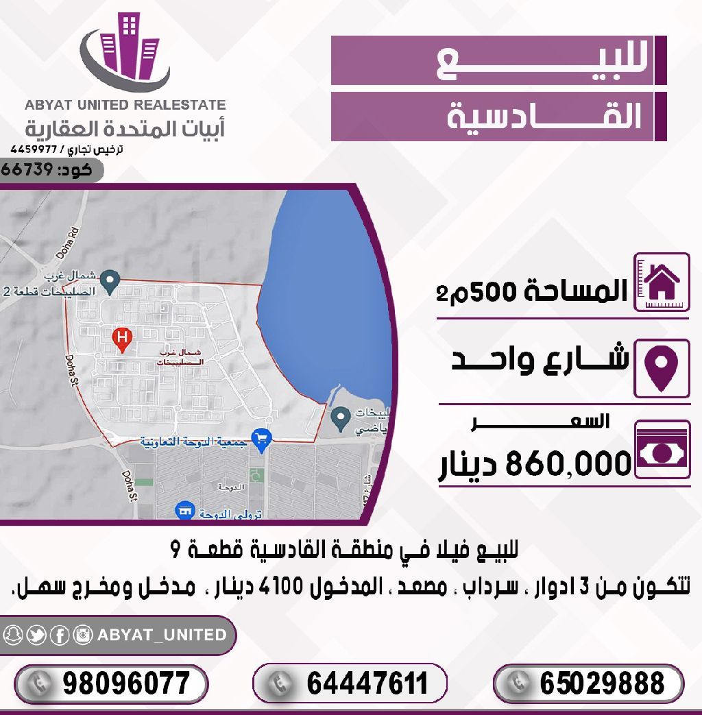 For sale: A villa in Al Qadisiyah, Block 9, located on a single street. The area is 500 square meters, consisting of 3 floors, a basement, and an elevator. The rental income is 4100 dinars, with easy access. For inquiries, contact Mobile 1, Mobile 2, Mobile 3. Price: 860,000 dinars. Code: 66739.