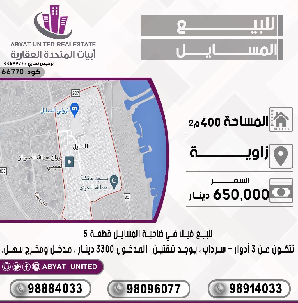 For sale: A villa in Al-Masayel suburb, plot 5, corner location. Area: 400 sqm. It consists of multiple floors, a basement, and includes two apartments. Rental income: 3300 dinars. Easy access and exit. For inquiries, contact Mobile 1, Mobile 2, Mobile 3. Price: 650,000 dinars. Code: 66770.