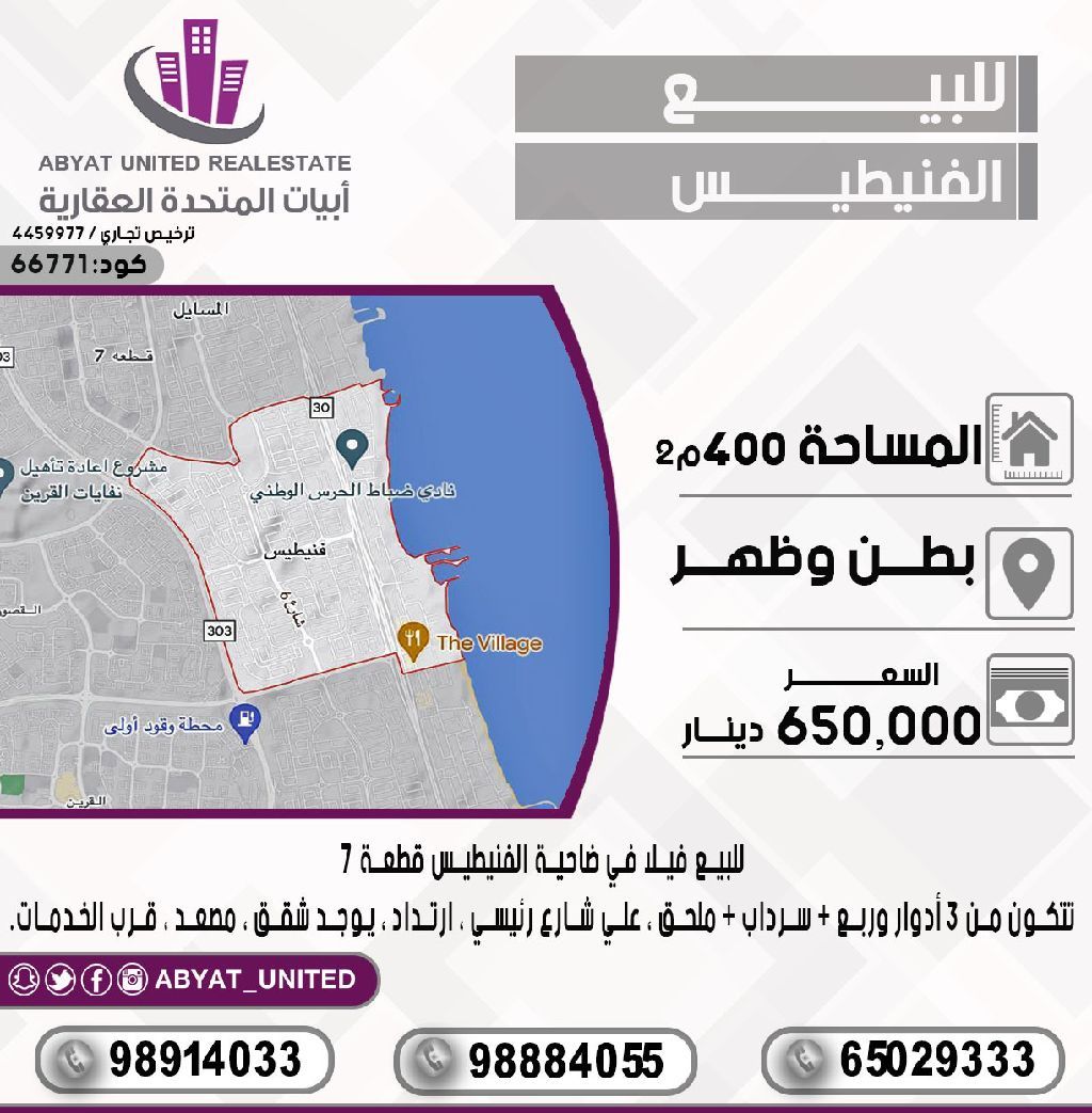 For sale: A villa in Fintas Block 7, with front and back access. The area is 400 square meters, consisting of 3 floors and a quarter, a basement, an annex, on a main street, with setbacks. It includes apartments, an elevator, and is near services. For inquiries, contact Mobile 1, Mobile 2, Mobile 3. Price: 650,000 Kuwaiti Dinars. Code: 66771.