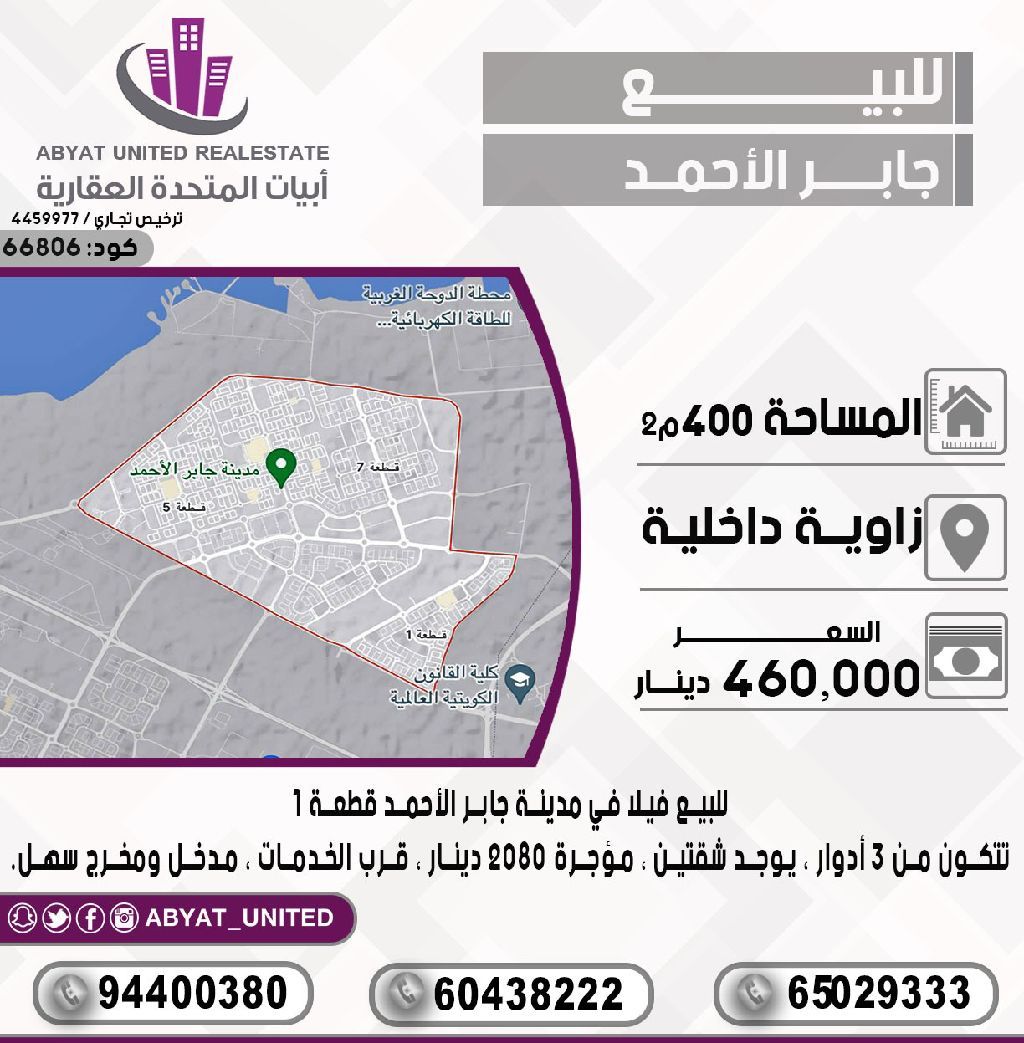 For sale: A villa in Jaber Al-Ahmad City, Plot 1 location, internal corner, area 400 sqm, consisting of 3 floors, with 2 apartments, rented for 2080 dinars, near services, easy access. For inquiries, Mobile 1, Mobile 2, Mobile 3. Price: 460,000 dinars. Code: 66806.