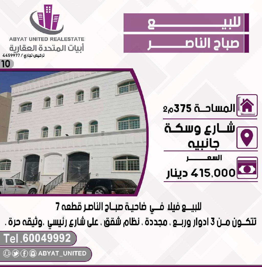 For sale: A villa in Sabah Al-Nasser suburb, plot 7, with an area of 375 square meters. The location is on a main street with a side alley. It consists of 3 floors and a quarter, is renovated, has an apartment system, and comes with a freehold document. For inquiries, call mobile number 1. Price: 415,000 Kuwaiti dinars, code 10.