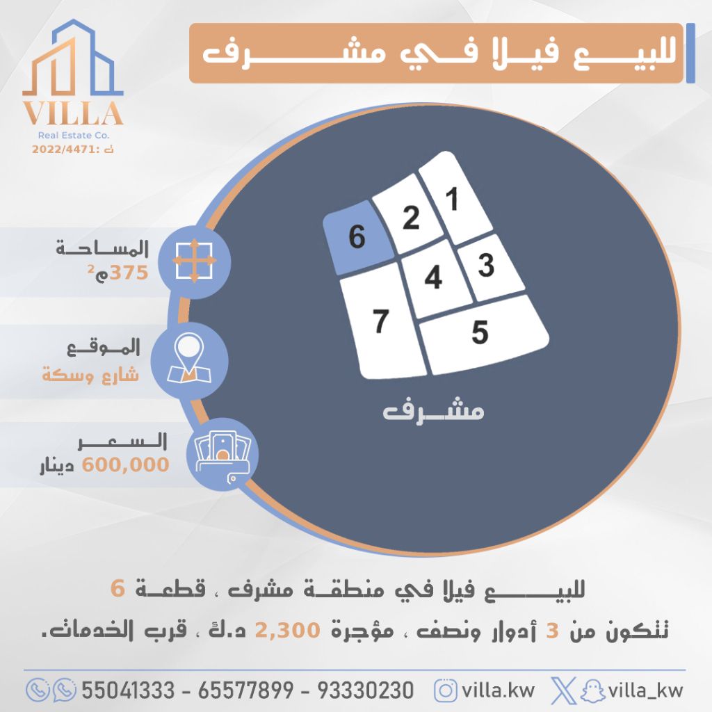 For sale: A villa in the Muraqab area, Plot 6, with an area of 375 square meters. The location is on a street and an alley. It consists of 3.5 floors and is rented for 2300 Kuwaiti Dinars, close to services. Price: 600,000 Kuwaiti Dinars. For inquiries, call mobile 1, mobile 2, mobile 3.