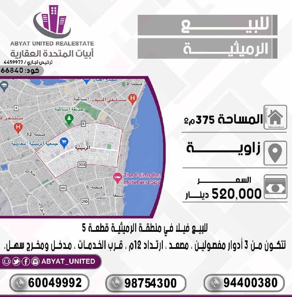 For sale: A villa in the Rumaithiya area, Plot 5, corner location. Area 375 sqm, consisting of 3 separate floors, elevator, 12m setback, near services, easy access. For inquiries, Mobile 1, Mobile 2, Mobile 3. Price 520,000 dinars. Code 66840.