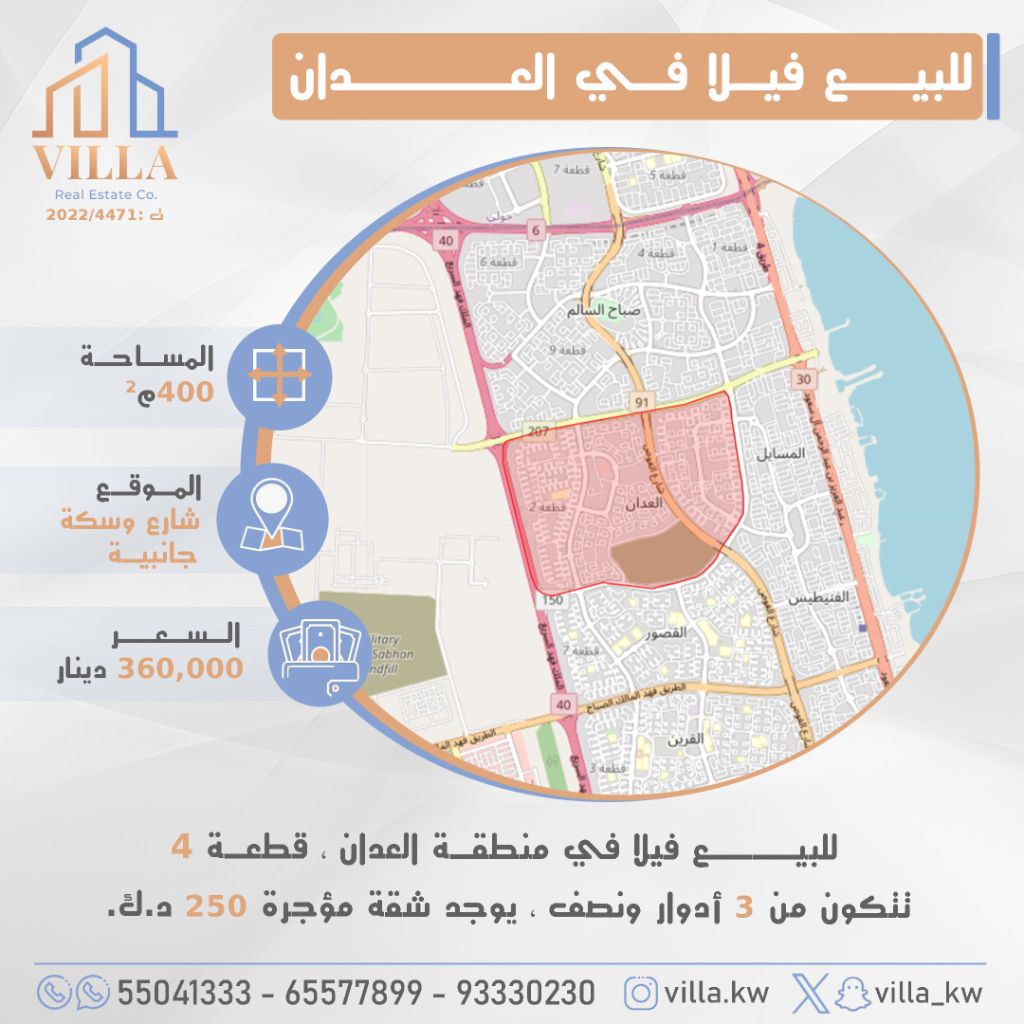 For sale: A villa in the Adan area, Plot 4, with an area of 400 square meters. The location is on a street with a side alley. It consists of 3.5 floors, and there is a rented apartment for 250 Kuwaiti dinars. The price is 360,000 Kuwaiti dinars. For inquiries, call mobile 1, mobile 2, mobile 3.
