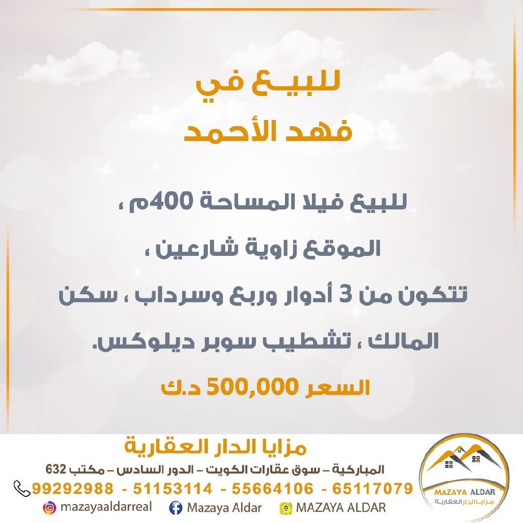 For sale, a villa in the Fahad Al-Ahmad area with an area of 400 square meters. The location is at the corner of two streets. It consists of 3 floors, a quarter floor, and a basement. The owner has lived in it, and it has super deluxe finishing. For serious buyers only, and brokers are prohibited. The price is 500,000 dinars. For inquiries, call the mobile number.