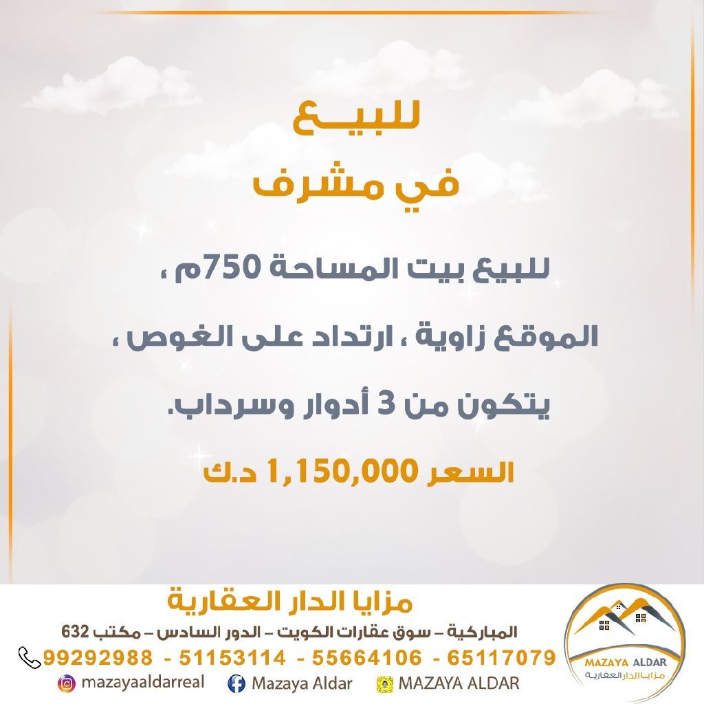 For sale: A house in the Al-Mishref area with an area of 750 square meters. The location is on a corner, overlooking the sea. It consists of 3 floors and a basement. For serious buyers only, and brokers are prohibited. The price is one million one hundred thousand dinars. For inquiries, contact via mobile.