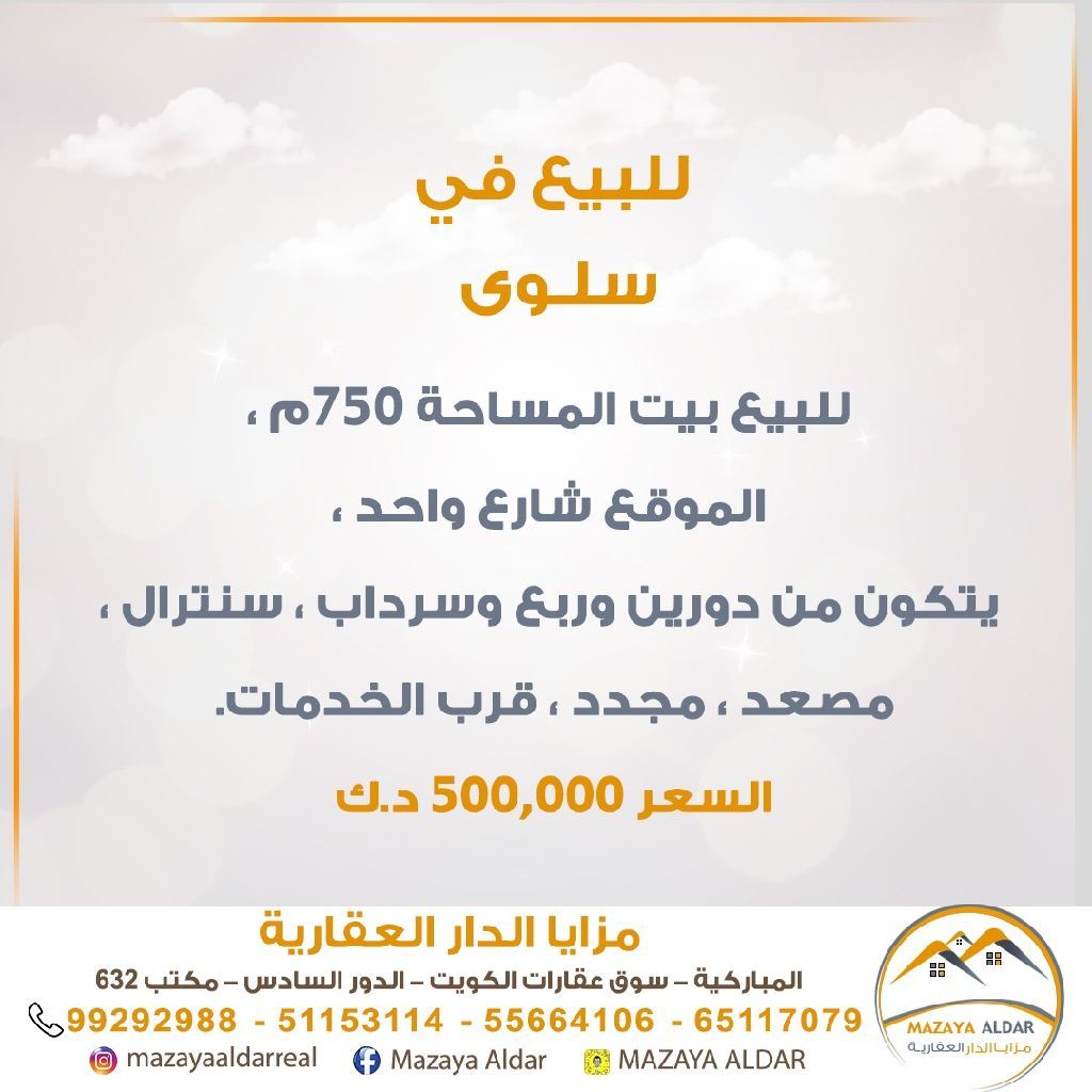 For sale: A house in the Salwa area with an area of 750 square meters. The location is on a single street. It consists of two floors, a quarter floor, and a basement. It has central air conditioning, an elevator, is renovated, and is near services. For serious buyers only, and brokers are prohibited. The price is 500,000 dinars. For inquiries, contact via mobile.