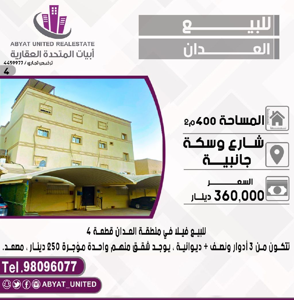 For sale, a villa in the Adan area, plot 4, located on a street with a side alley. Area: 400 square meters. It consists of 3.5 floors, a diwaniya (reception area), and includes apartments, one of which is a master apartment rented for 250 dinars. It has an elevator. For inquiries, mobile number 1. Price: 360,000 dinars. Code: 4.