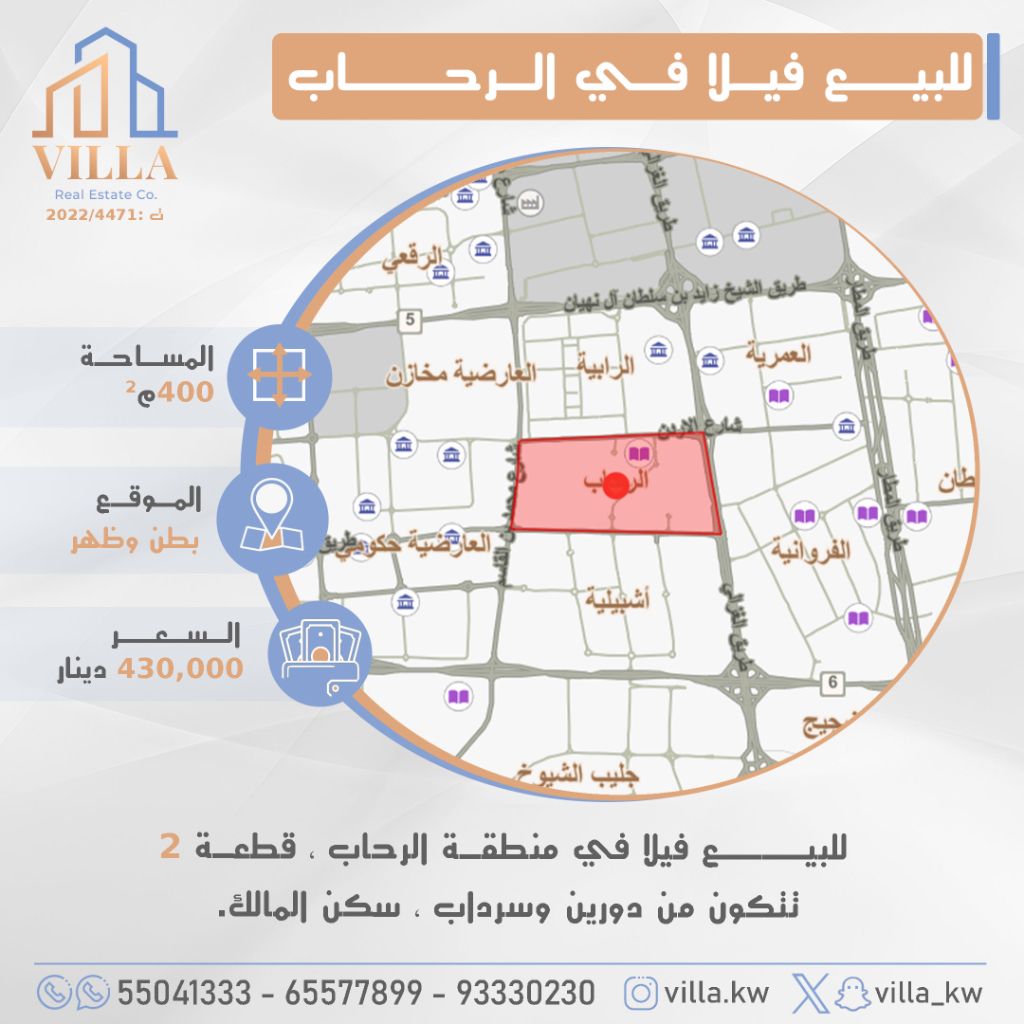 For sale: A villa in the Al-Rahab area, Plot 2, with an area of 400 square meters. The location is front and back. It consists of two floors and a basement, and was owner-occupied. Price: 430,000 Kuwaiti Dinars. For inquiries, call mobile 1, mobile 2, mobile 3.